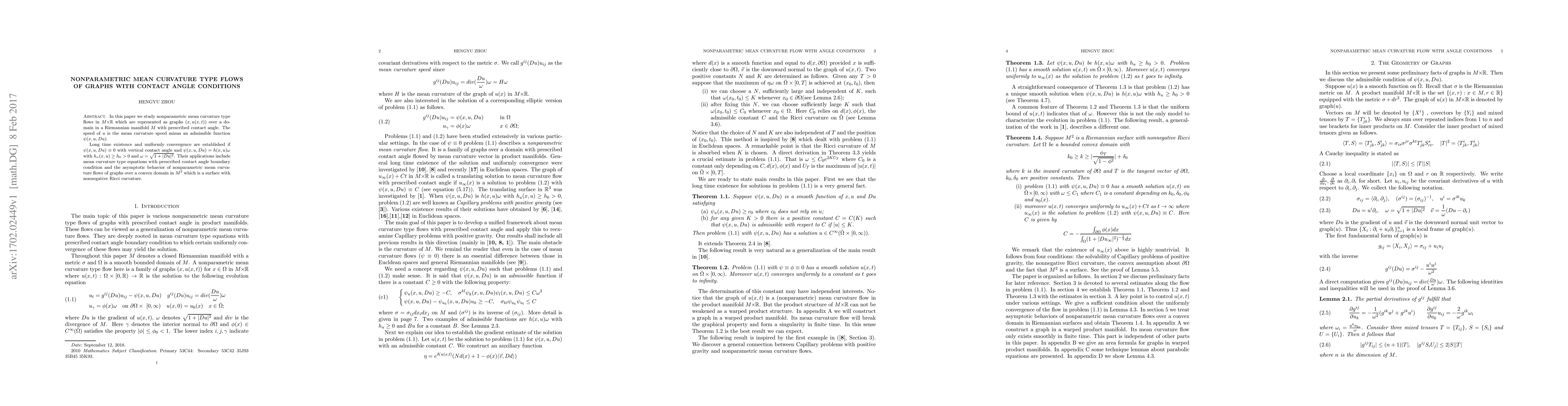 In this paper we study nonparametric mean curvature type flows in $M\times\mathbb{R}$ which are represented as graphs $(x,u(x,t))$ over a domain in a Riemannian manifold $M$ with prescribed contact angle. The speed of $u$ is the mean curvature speed minus an admissible function $\psi(x,u,Du)$. Long time existence and uniformly convergence are established if $\psi(x,u, Du)\equiv 0$ with vertical contact angle and $\psi(x,u,Du)=h(x,u)\omega$ with $h_u(x,u)\geq h_0>0$ and $\omega=\sqrt{1+|Du|^2}$. Their applications include mean curvature type equations with prescribed contact angle boundary condition and the asymptotic behavior of nonparametric mean curvature flows of graphs over a convex domain in $M^2$ which is a surface with nonnegative Ricci curvature.