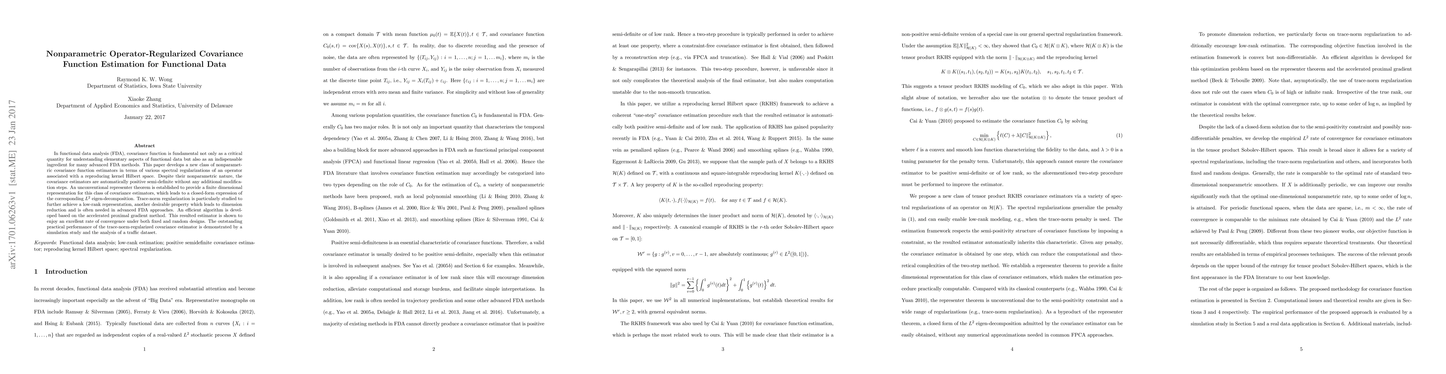 This paper introduces a new class of nonparametric covariance function estimators for functional data analysis, employing spectral regularizations and a representer theorem to ensure positive semi-definiteness and low-rank representations. An efficient algorithm based on the accelerated proximal gradient method is developed, demonstrating excellent convergence rates and practical performance.