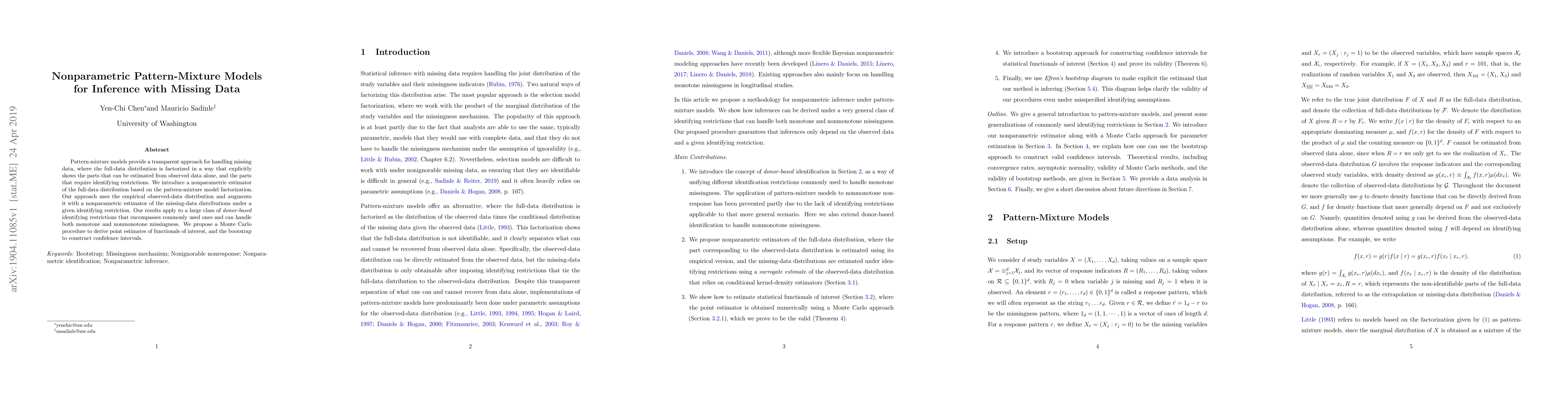 This research introduces a nonparametric method using pattern-mixture models to handle missing data, factorizing the full-data distribution into estimable and restricted parts. It proposes a Monte Carlo procedure for functional estimates and the bootstrap for confidence intervals, applicable to various identifying restrictions including monotone and nonmonotone missingness.