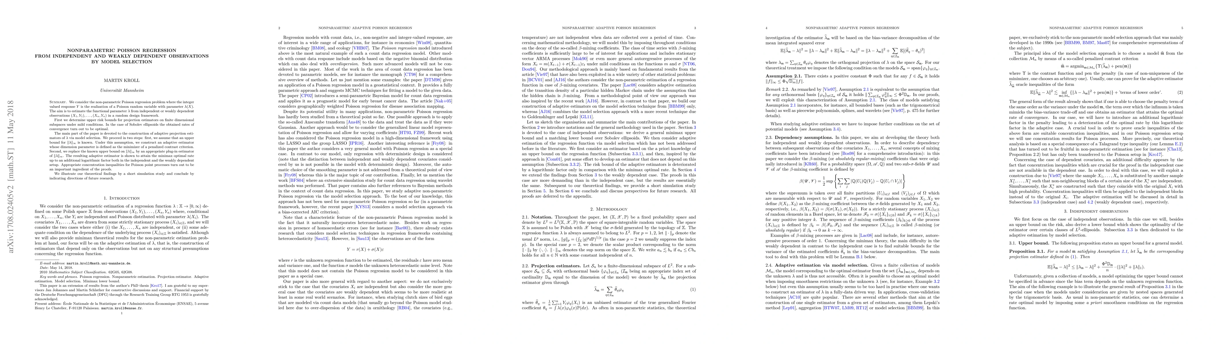 We consider the non-parametric Poisson regression problem where the integer valued response $Y$ is the realization of a Poisson random variable with parameter $\lambda(X)$. The aim is to estimate the functional parameter $\lambda$ from independent or weakly dependent observations $(X_1,Y_1),\ldots,(X_n,Y_n)$ in a random design framework. First we determine upper risk bounds for projection estimators on finite dimensional subspaces under mild conditions. In the case of Sobolev ellipsoids the obtained rates of convergence turn out to be optimal. The main part of the paper is devoted to the construction of adaptive projection estimators of $\lambda$ via model selection. We proceed in two steps: first, we assume that an upper bound for $\Vert \lambda \Vert_\infty$ is known. Under this assumption, we construct an adaptive estimator whose dimension parameter is defined as the minimizer of a penalized contrast criterion. Second, we replace the known upper bound on $\Vert \lambda \Vert_\infty$ by an appropriate plug-in estimator of $\Vert \lambda \Vert_\infty$. The resulting adaptive estimator is shown to attain the minimax optimal rate up to an additional logarithmic factor both in the independent and the weakly dependent setup. Appropriate concentration inequalities for Poisson point processes turn out to be an important ingredient of the proofs. We illustrate our theoretical findings by a short simulation study and conclude by indicating directions of future research.