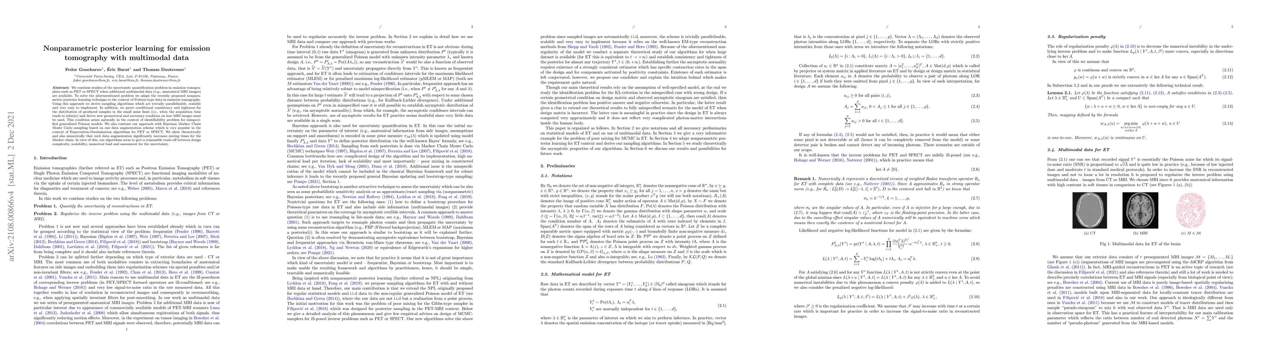 This paper adapts nonparametric posterior learning for emission tomography using multimodal data, demonstrating scalable and parallelizable sampling algorithms. The proposed method shows conditional consistency and outperforms traditional Bayesian Markov Chain Monte Carlo methods in terms of mixing times and computational efficiency.