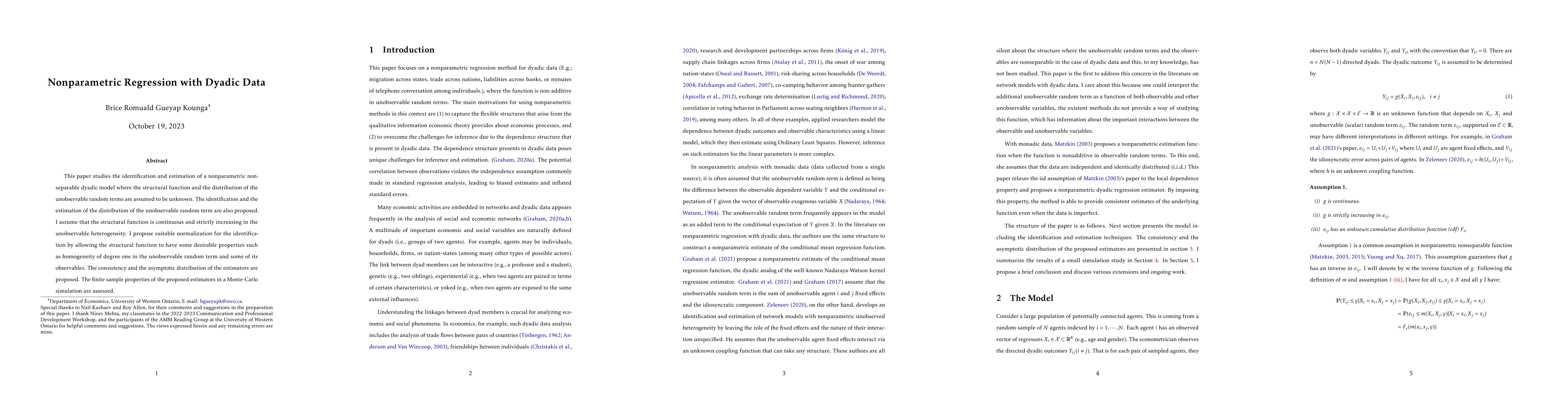 This paper explores nonparametric regression in dyadic models with unknown structural functions and random terms, proposing methods for identification and estimation. It assesses the consistency and asymptotic distribution of the estimators, and evaluates their finite sample performance through Monte Carlo simulations.