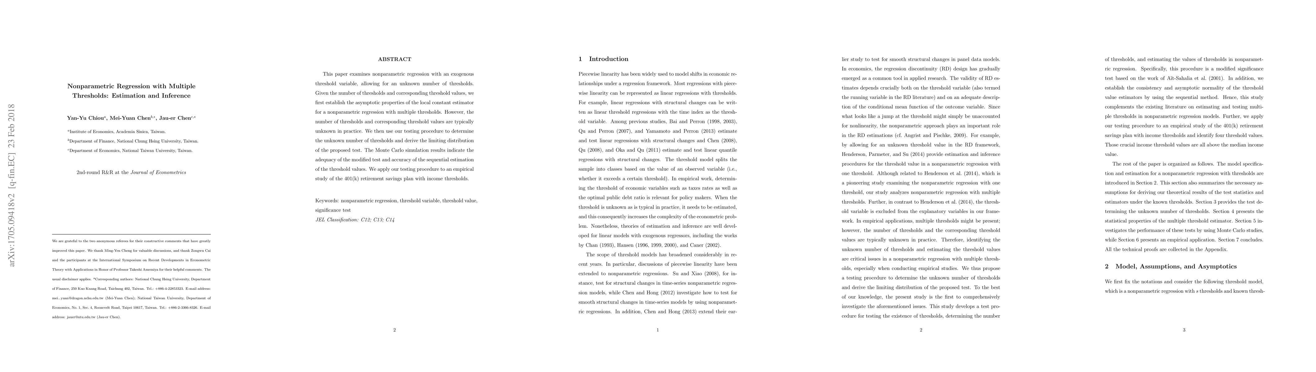 This paper develops a method for nonparametric regression with multiple unknown thresholds, establishing the asymptotic properties of the local constant estimator and proposing a test to determine the number of thresholds. The method is validated through simulations and applied to an empirical study on 401(k) retirement savings plans.