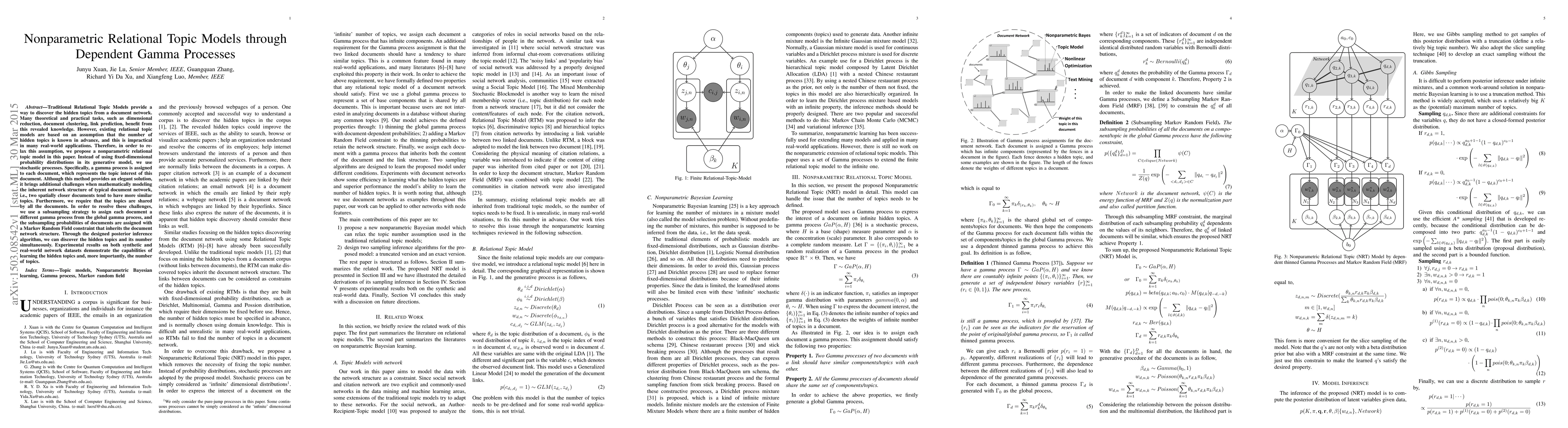 This paper proposes a nonparametric relational topic model using dependent gamma processes to discover hidden topics in document networks without requiring a predefined number of topics. It addresses the challenge of modeling the inherent network structure by employing a subsampling strategy with Markov Random Field constraints, allowing the model to infer both the hidden topics and their number.