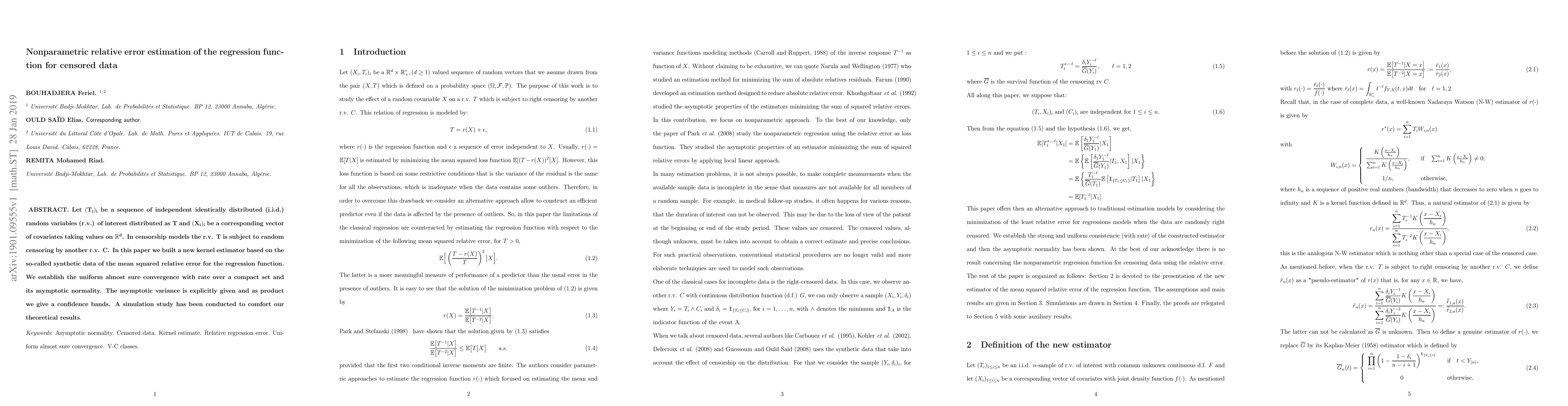 Let $ (T_i)_i$ be a sequence of independent identically distributed (i.i.d.) random variables (r.v.) of interest distributed as $ T$ and $(X_i)_i$ be a corresponding vector of covariates taking values on $ \mathbb{R}^d$. In censorship models the r.v. $T$ is subject to random censoring by another r.v. $C$. In this paper we built a new kernel estimator based on the so-called synthetic data of the mean squared relative error for the regression function. We establish the uniform almost sure convergence with rate over a compact set and its asymptotic normality. The asymptotic variance is explicitly given and as product we give a confidence bands. A simulation study has been conducted to comfort our theoretical results