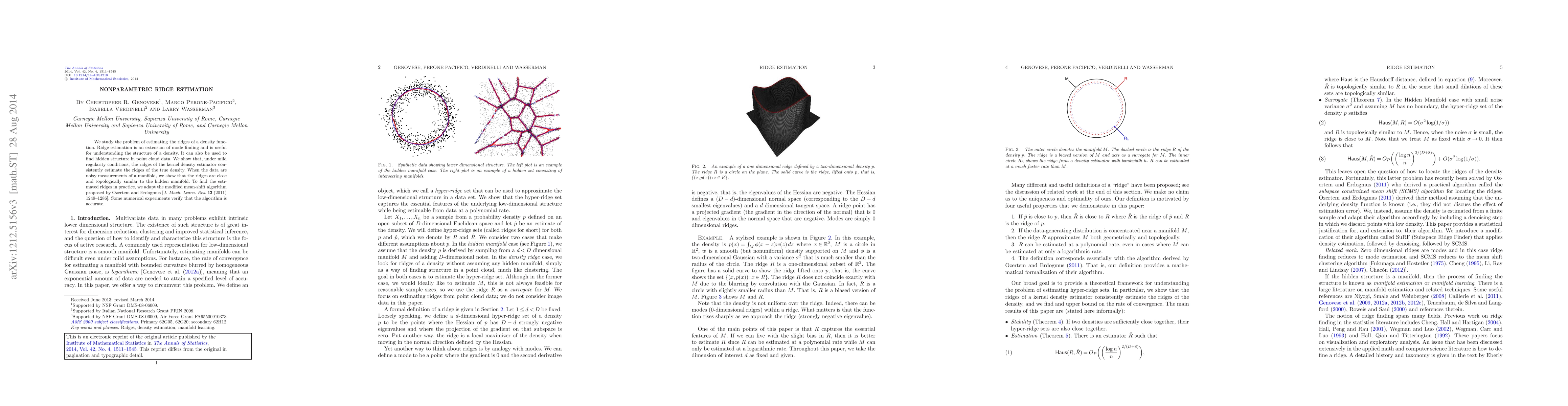 We study the problem of estimating the ridges of a density function. Ridge estimation is an extension of mode finding and is useful for understanding the structure of a density. It can also be used to find hidden structure in point cloud data. We show that, under mild regularity conditions, the ridges of the kernel density estimator consistently estimate the ridges of the true density. When the data are noisy measurements of a manifold, we show that the ridges are close and topologically similar to the hidden manifold. To find the estimated ridges in practice, we adapt the modified mean-shift algorithm proposed by Ozertem and Erdogmus [J. Mach. Learn. Res. 12 (2011) 1249-1286]. Some numerical experiments verify that the algorithm is accurate.