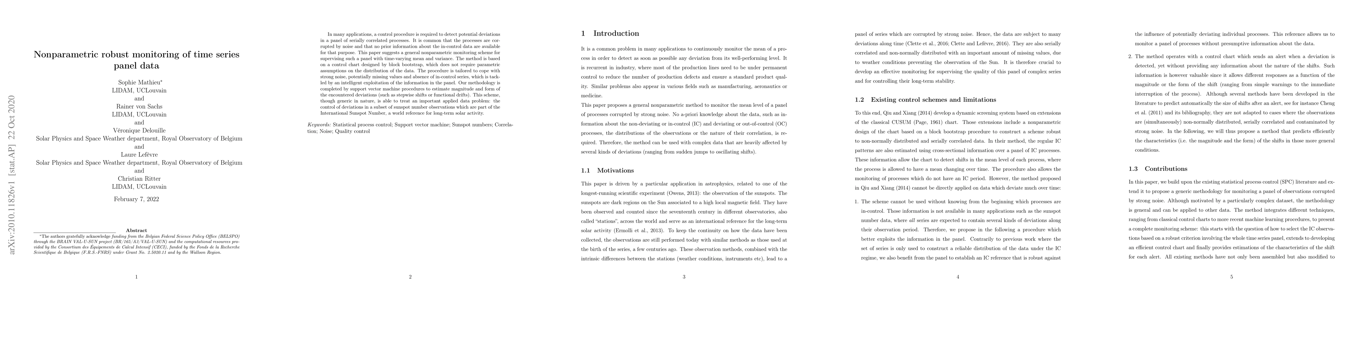 In many applications, a control procedure is required to detect potential deviations in a panel of serially correlated processes. It is common that the processes are corrupted by noise and that no prior information about the in-control data are available for that purpose. This paper suggests a general nonparametric monitoring scheme for supervising such a panel with time-varying mean and variance. The method is based on a control chart designed by block bootstrap, which does not require parametric assumptions on the distribution of the data. The procedure is tailored to cope with strong noise, potentially missing values and absence of in-control series, which is tackled by an intelligent exploitation of the information in the panel. Our methodology is completed by support vector machine procedures to estimate magnitude and form of the encountered deviations (such as stepwise shifts or functional drifts). This scheme, though generic in nature, is able to treat an important applied data problem: the control of deviations in a subset of sunspot number observations which are part of the International Sunspot Number, a world reference for long-term solar activity.
