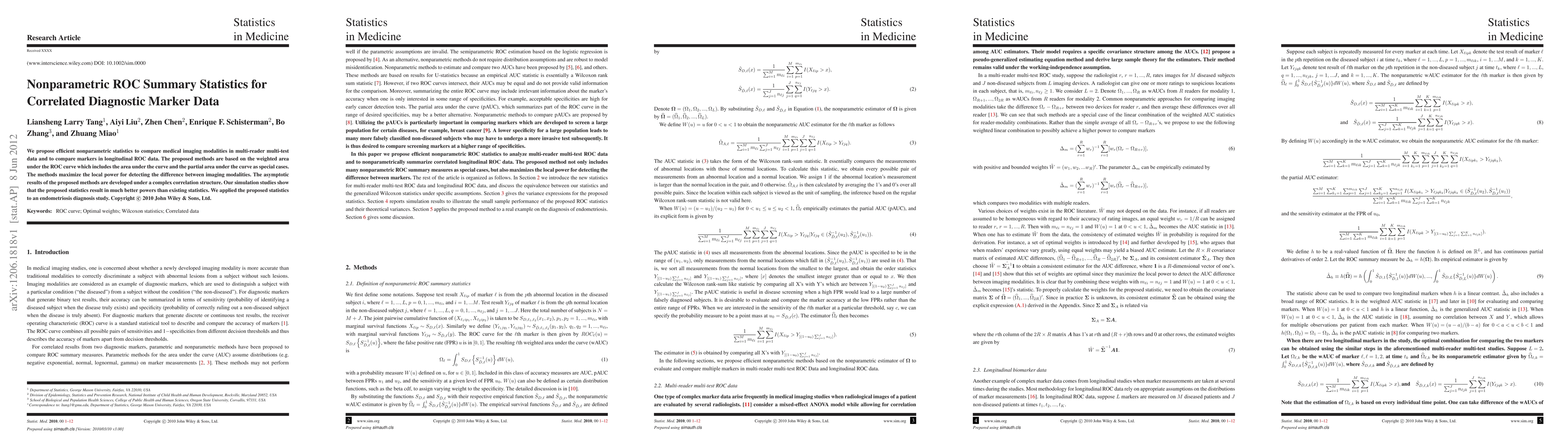 This paper introduces novel nonparametric statistics for comparing correlated diagnostic markers, particularly in multi-reader multi-test and longitudinal ROC data. The proposed methods, based on the weighted area under the ROC curve, demonstrate superior power compared to existing methods, as shown through simulation studies and an application to an endometriosis diagnosis study.