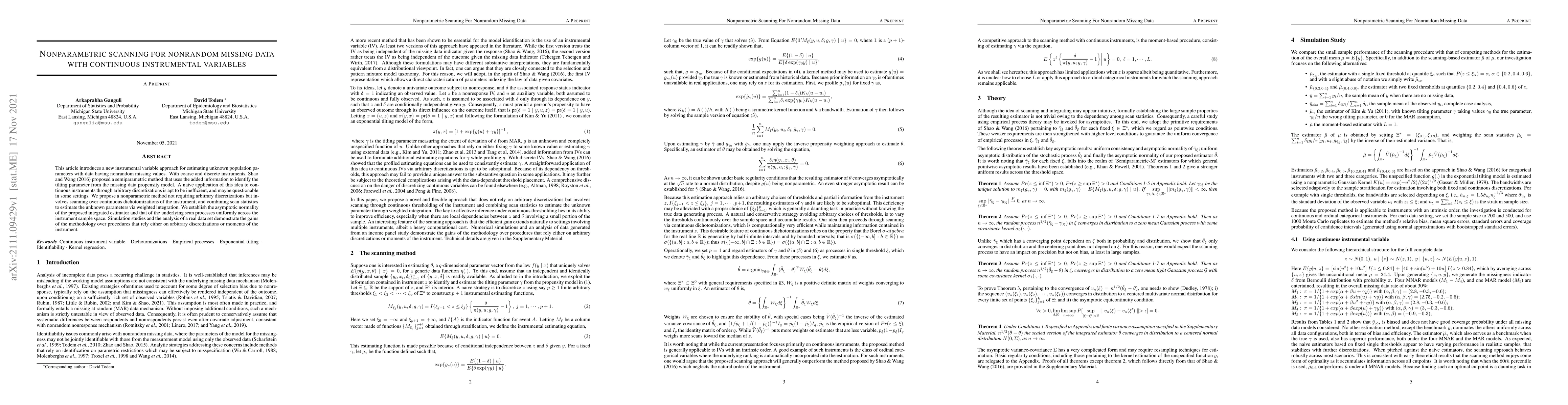 This paper proposes a nonparametric method for estimating population parameters with nonrandom missing data, using continuous instrumental variables without requiring arbitrary discretizations. The method involves scanning over continuous dichotomizations and combining scan statistics for efficient estimation, demonstrating improved performance over traditional discretization-based methods.