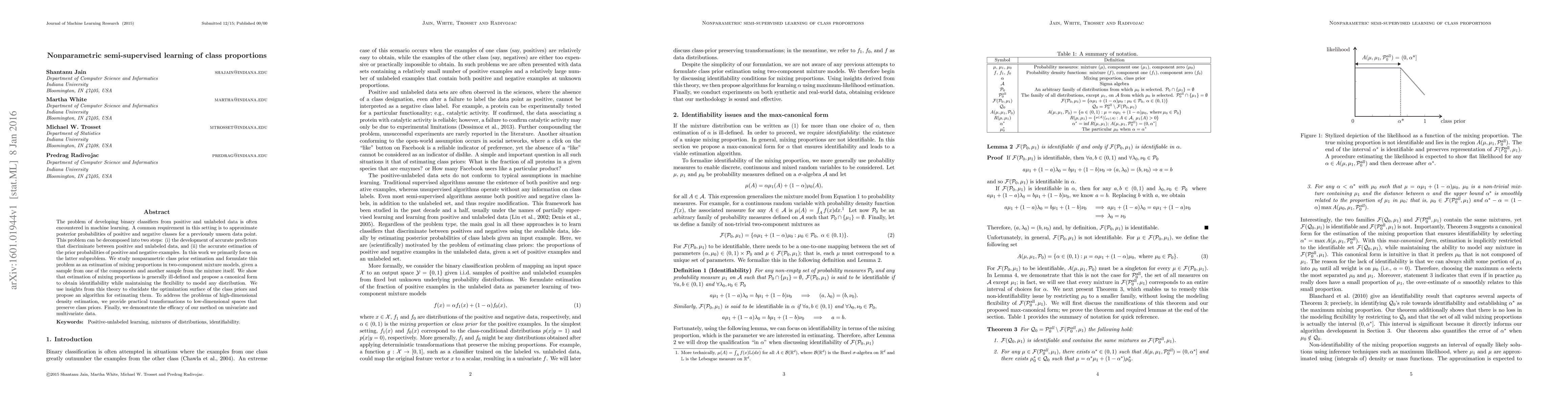 The problem of developing binary classifiers from positive and unlabeled data is often encountered in machine learning. A common requirement in this setting is to approximate posterior probabilities of positive and negative classes for a previously unseen data point. This problem can be decomposed into two steps: (i) the development of accurate predictors that discriminate between positive and unlabeled data, and (ii) the accurate estimation of the prior probabilities of positive and negative examples. In this work we primarily focus on the latter subproblem. We study nonparametric class prior estimation and formulate this problem as an estimation of mixing proportions in two-component mixture models, given a sample from one of the components and another sample from the mixture itself. We show that estimation of mixing proportions is generally ill-defined and propose a canonical form to obtain identifiability while maintaining the flexibility to model any distribution. We use insights from this theory to elucidate the optimization surface of the class priors and propose an algorithm for estimating them. To address the problems of high-dimensional density estimation, we provide practical transformations to low-dimensional spaces that preserve class priors. Finally, we demonstrate the efficacy of our method on univariate and multivariate data.