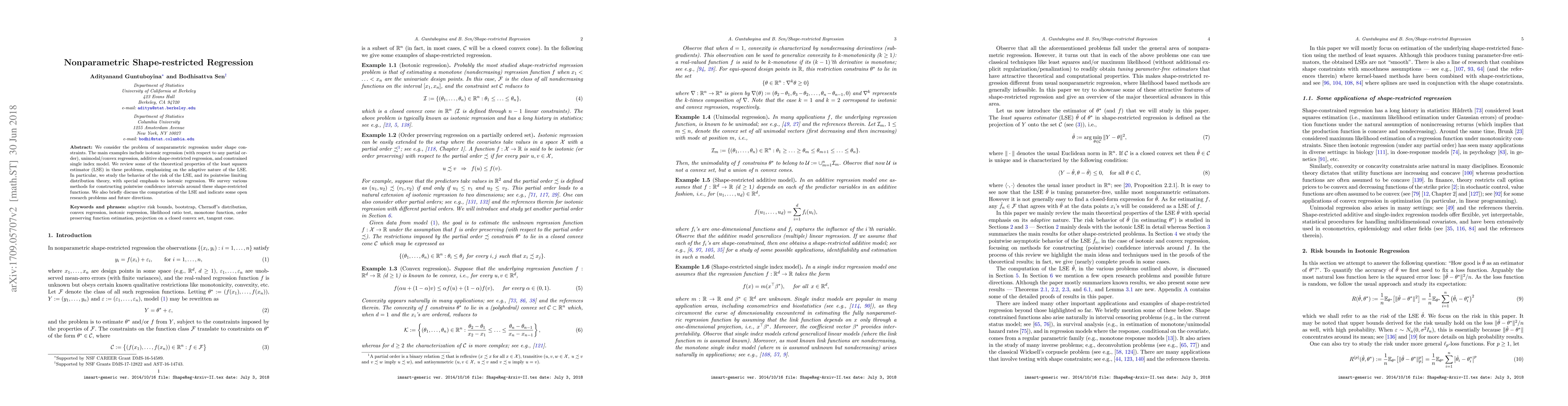This paper reviews nonparametric shape-restricted regression techniques, focusing on isotonic, unimodal, and convex regression. It examines the least squares estimator's adaptive properties, risk behavior, and pointwise limiting distributions, and discusses methods for constructing confidence intervals.