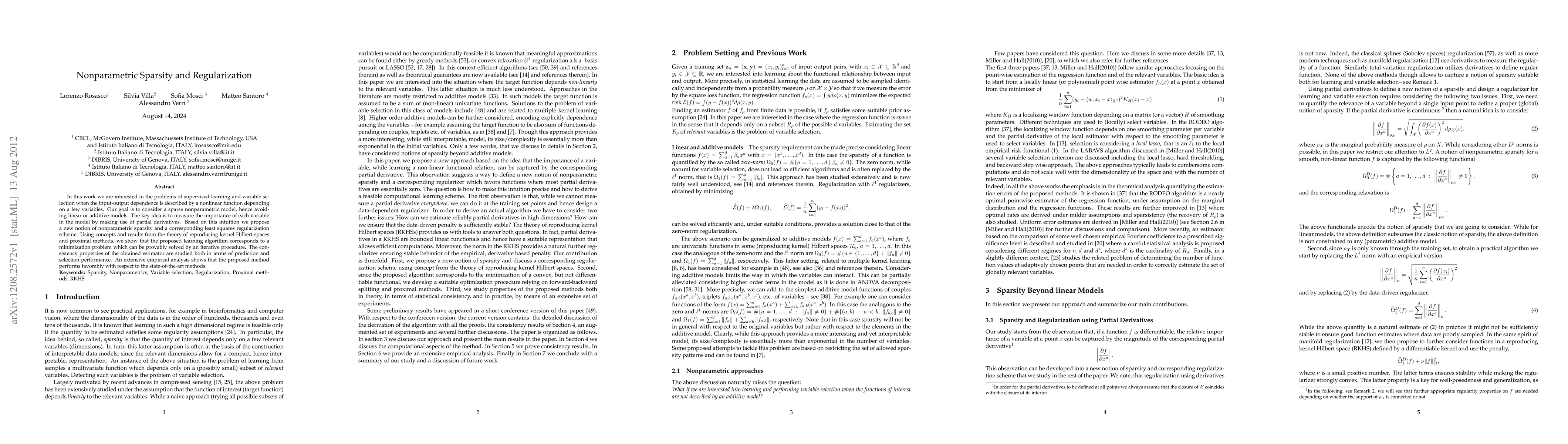 In this work we are interested in the problems of supervised learning and variable selection when the input-output dependence is described by a nonlinear function depending on a few variables. Our goal is to consider a sparse nonparametric model, hence avoiding linear or additive models. The key idea is to measure the importance of each variable in the model by making use of partial derivatives. Based on this intuition we propose a new notion of nonparametric sparsity and a corresponding least squares regularization scheme. Using concepts and results from the theory of reproducing kernel Hilbert spaces and proximal methods, we show that the proposed learning algorithm corresponds to a minimization problem which can be provably solved by an iterative procedure. The consistency properties of the obtained estimator are studied both in terms of prediction and selection performance. An extensive empirical analysis shows that the proposed method performs favorably with respect to the state-of-the-art methods.