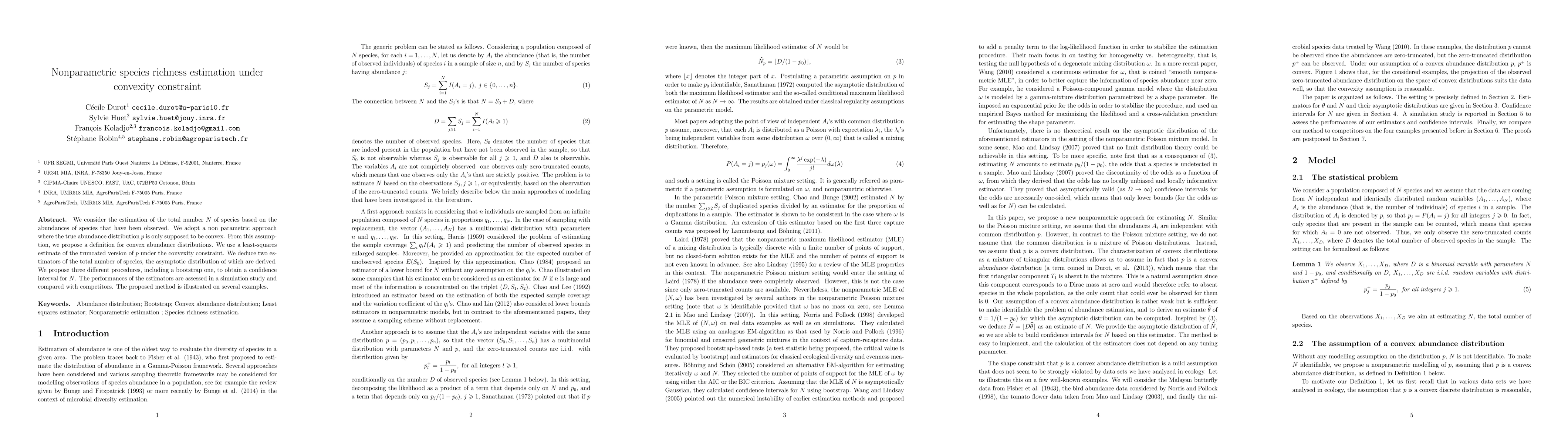 The paper introduces a novel nonparametric approach for species richness estimation under convexity constraint, providing explicit estimators and confidence intervals with theoretical justification.