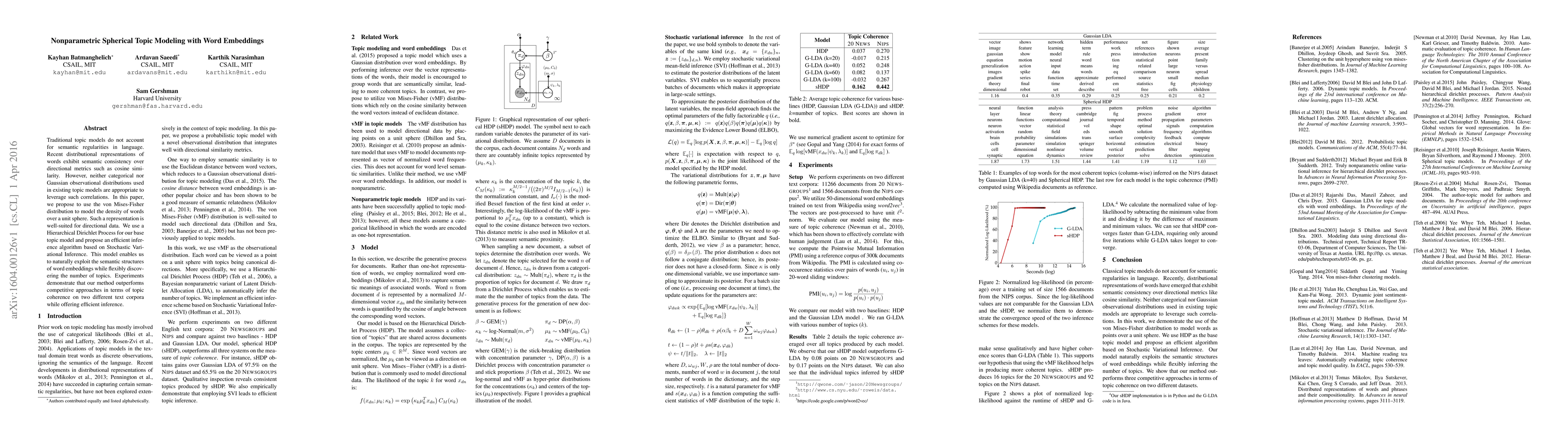 This paper proposes a nonparametric spherical topic model using von Mises-Fisher distribution to represent word embeddings on a unit sphere, enabling better exploitation of semantic structures. The model employs a Hierarchical Dirichlet Process and Stochastic Variational Inference, outperforming other methods in topic coherence and efficiency.