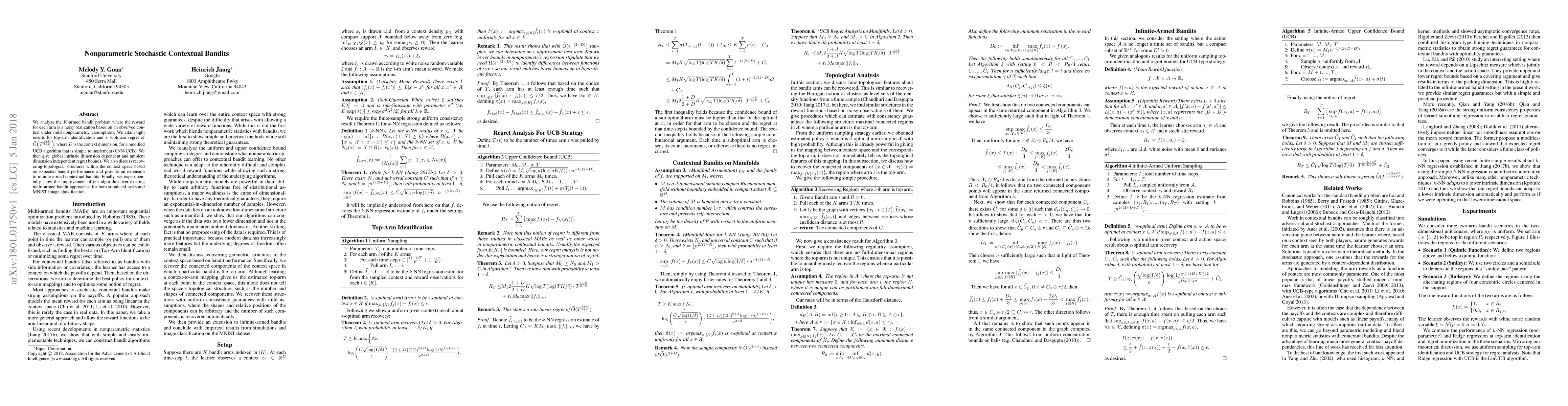 This paper studies nonparametric stochastic contextual bandits, achieving tight results for top-arm identification and sublinear regret with a modified UCB algorithm. Experimental results demonstrate the algorithm's superiority over existing methods for both simulated tasks and MNIST classification.
