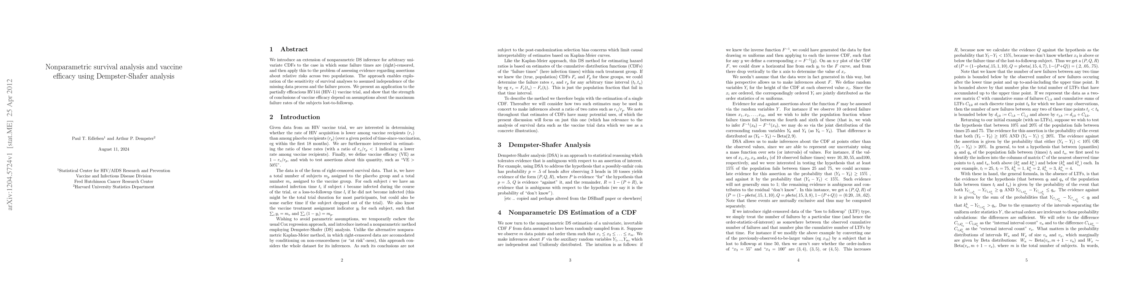 We introduce an extension of nonparametric DS inference for arbitrary univariate CDFs to the case in which some failure times are (right)-censored, and then apply this to the problem of assessing evidence regarding assertions about relative risks across two populations. The approach enables exploration of the sensitivity of survival analyses to assumed independence of the missing data process and the failure proces. We present an application to the partially efficacious RV144 (HIV-1) vaccine trial, and show that the strength of conclusions of vaccine efficacy depend on assumptions about the maximum failure rates of the subjects lost-to-followup.