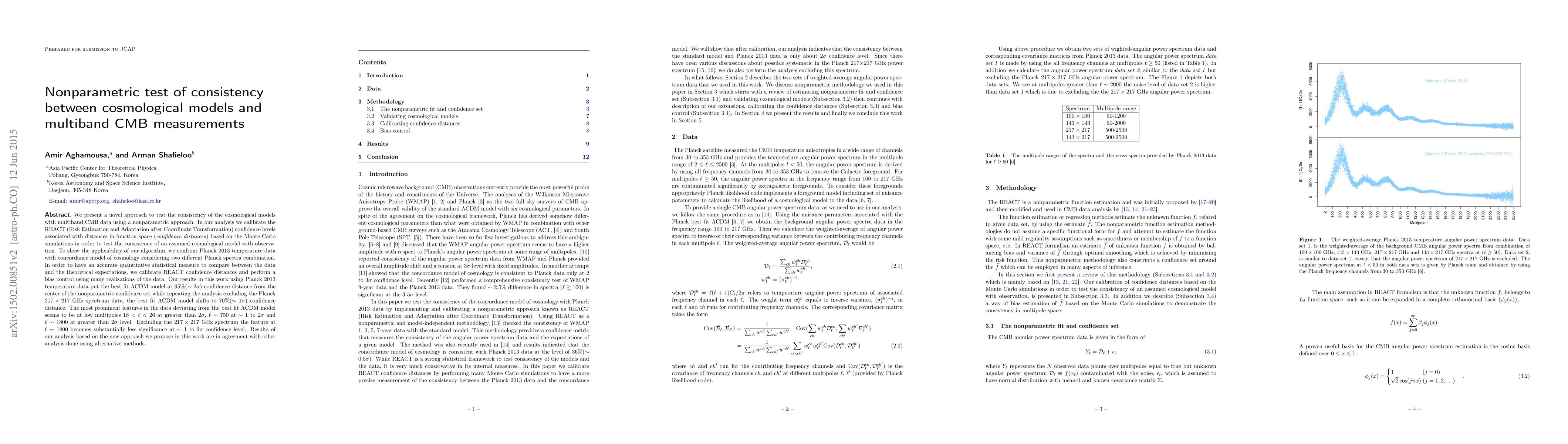 We present a novel approach to test the consistency of the cosmological models with multiband CMB data using a nonparametric approach. In our analysis we calibrate the REACT (Risk Estimation and Adaptation after Coordinate Transformation) confidence levels associated with distances in function space (\textit{confidence distances}) based on the Monte Carlo simulations in order to test the consistency of an assumed cosmological model with observation. To show the applicability of our algorithm, we confront Planck 2013 temperature data with concordance model of cosmology considering two different Planck spectra combination. In order to have an accurate quantitative statistical measure to compare between the data and the theoretical expectations, we calibrate REACT confidence distances and perform a bias control using many realizations of the data. Our results in this work using Planck 2013 temperature data put the best fit $\Lambda$CDM model at $95\% (\sim 2\sigma)$ confidence distance from the center of the nonparametric confidence set while repeating the analysis excluding the Planck $217 \times 217$ GHz spectrum data, the best fit $\Lambda$CDM model shifts to $70\% (\sim 1\sigma)$ confidence distance. The most prominent features in the data deviating from the best fit $\Lambda$CDM model seems to be at low multipoles $ 18 < \ell < 26$ at greater than $2\sigma$, $\ell \sim 750$ at $\sim1$ to $2 \sigma$ and $\ell \sim 1800$ at greater than $2\sigma$ level. Excluding the $217\times217$ GHz spectrum the feature at $\ell \sim 1800$ becomes substantially less significance at $\sim1$ to $2 \sigma$ confidence level. Results of our analysis based on the new approach we propose in this work are in agreement with other analysis done using alternative methods.