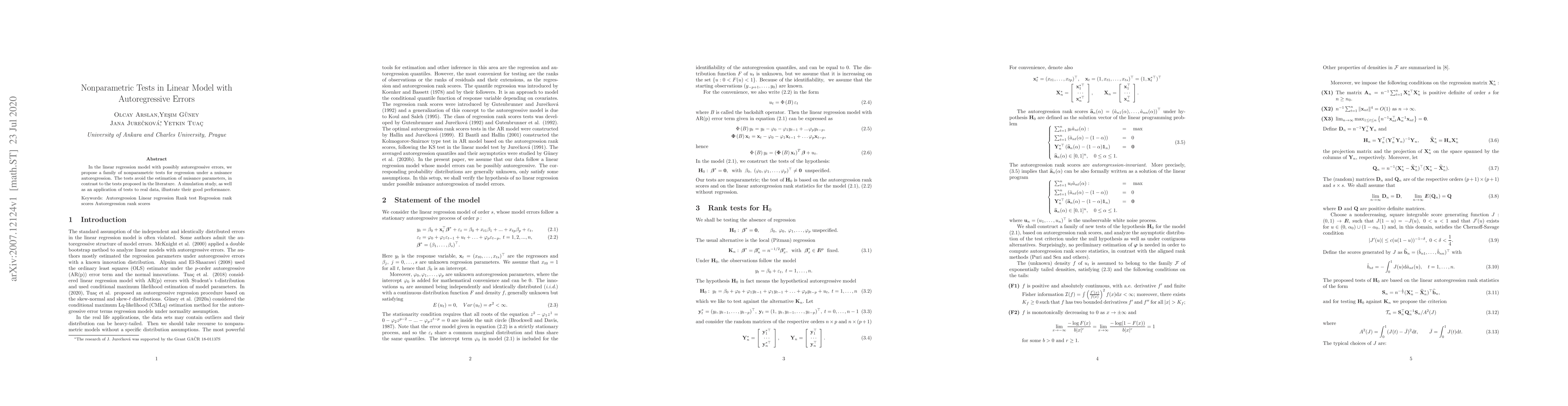 Summary: This paper introduces a set of nonparametric tests for linear regression models with autoregressive errors, bypassing the need for estimating nuisance parameters, unlike existing parametric approaches. The proposed tests aim to enhance the robustness and efficiency of regression analysis.