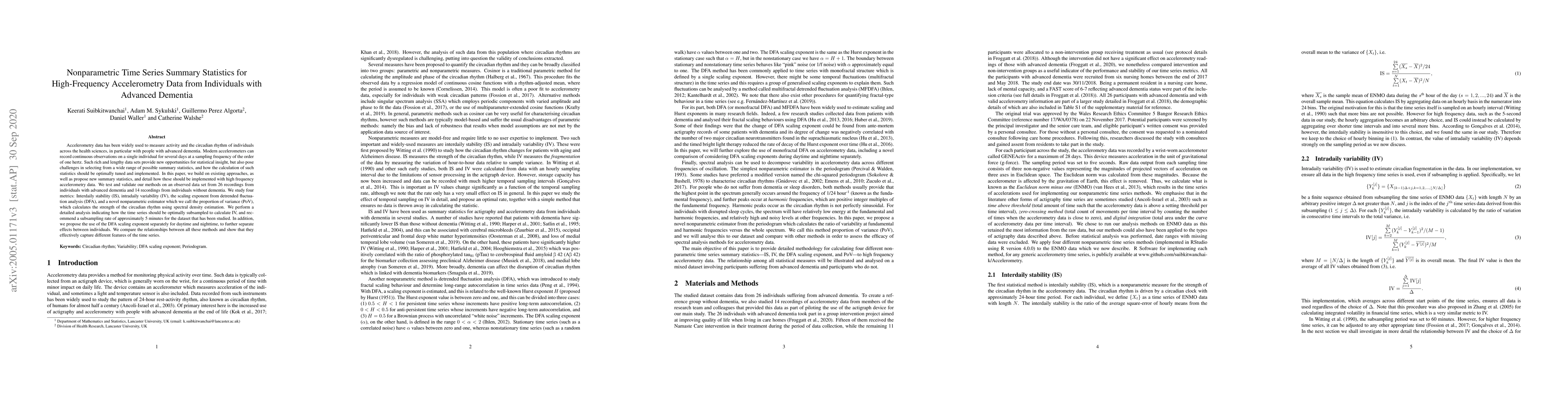 Accelerometry data has been widely used to measure activity and the circadian rhythm of individuals across the health sciences, in particular with people with advanced dementia. Modern accelerometers can record continuous observations on a single individual for several days at a sampling frequency of the order of one hertz. Such rich and lengthy data sets provide new opportunities for statistical insight, but also pose challenges in selecting from a wide range of possible summary statistics, and how the calculation of such statistics should be optimally tuned and implemented. In this paper, we build on existing approaches, as well as propose new summary statistics, and detail how these should be implemented with high frequency accelerometry data. We test and validate our methods on an observed data set from 26 recordings from individuals with advanced dementia and 14 recordings from individuals without dementia. We study four metrics: Interdaily stability (IS), intradaily variability (IV), the scaling exponent from detrended fluctuation analysis (DFA), and a novel nonparametric estimator which we call the proportion of variance (PoV), which calculates the strength of the circadian rhythm using spectral density estimation. We perform a detailed analysis indicating how the time series should be optimally subsampled to calculate IV, and recommend a subsampling rate of approximately 5 minutes for the dataset that has been studied. In addition, we propose the use of the DFA scaling exponent separately for daytime and nighttime, to further separate effects between individuals. We compare the relationships between all these methods and show that they effectively capture different features of the time series.