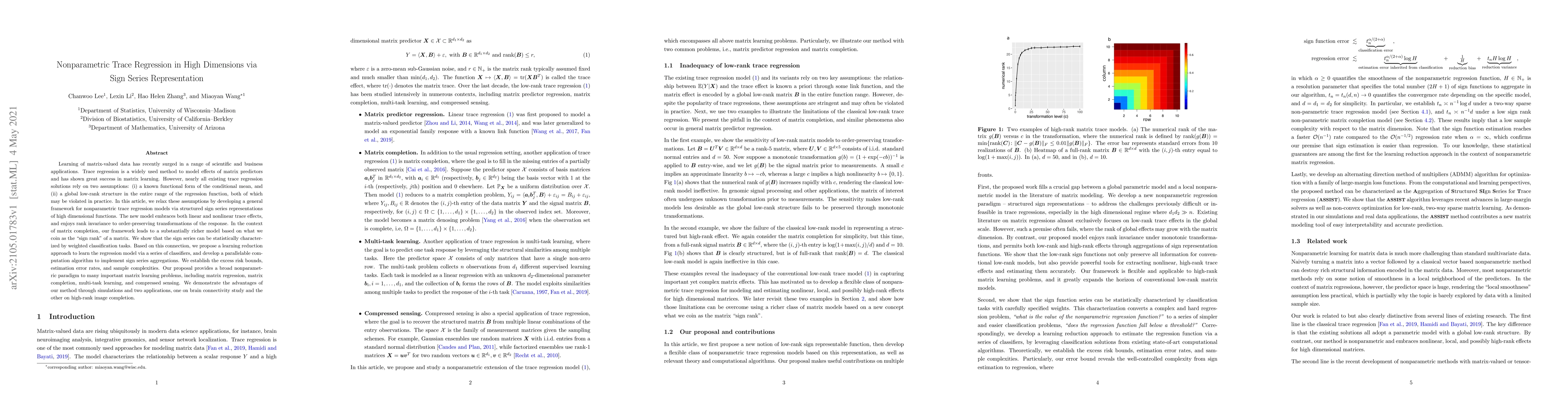 This research introduces a nonparametric trace regression model for matrix-valued data, relaxing common assumptions of known functional form and global low-rank structure. The model uses structured sign series representations, accommodating both linear and nonlinear effects, and maintaining rank invariance under transformations. It offers a richer model for matrix completion, characterized by 'sign rank'. The paper presents a learning reduction approach via classifiers and a parallel computation algorithm, providing excess risk bounds, estimation error rates, and sample complexities. The method is demonstrated through simulations and applications in brain connectivity studies and high-rank image completion.