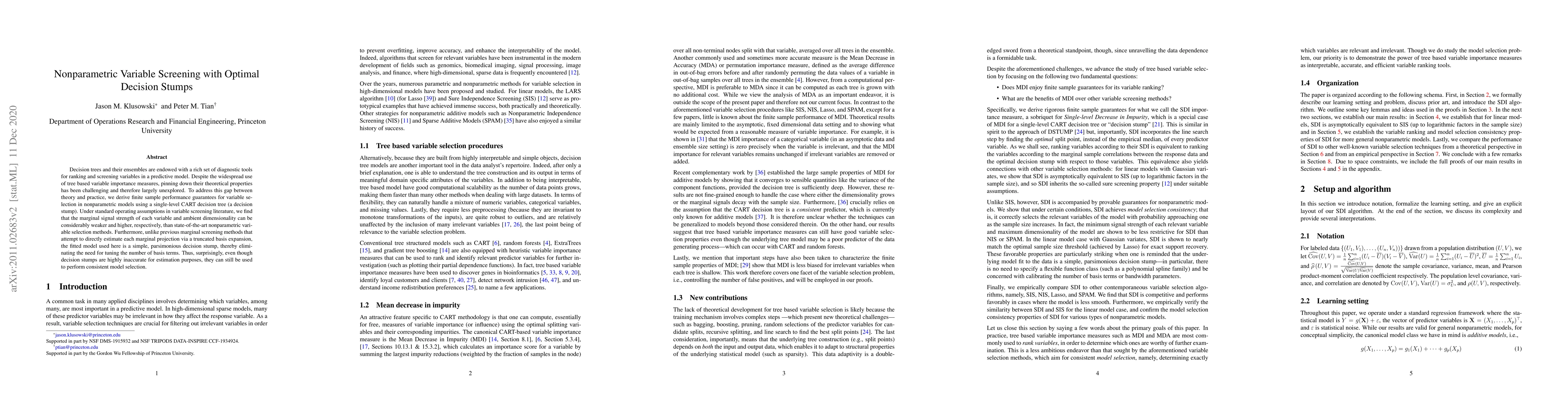 Decision trees and their ensembles are endowed with a rich set of diagnostic tools for ranking and screening variables in a predictive model. Despite the widespread use of tree based variable importance measures, pinning down their theoretical properties has been challenging and therefore largely unexplored. To address this gap between theory and practice, we derive finite sample performance guarantees for variable selection in nonparametric models using a single-level CART decision tree (a decision stump). Under standard operating assumptions in variable screening literature, we find that the marginal signal strength of each variable and ambient dimensionality can be considerably weaker and higher, respectively, than state-of-the-art nonparametric variable selection methods. Furthermore, unlike previous marginal screening methods that attempt to directly estimate each marginal projection via a truncated basis expansion, the fitted model used here is a simple, parsimonious decision stump, thereby eliminating the need for tuning the number of basis terms. Thus, surprisingly, even though decision stumps are highly inaccurate for estimation purposes, they can still be used to perform consistent model selection.