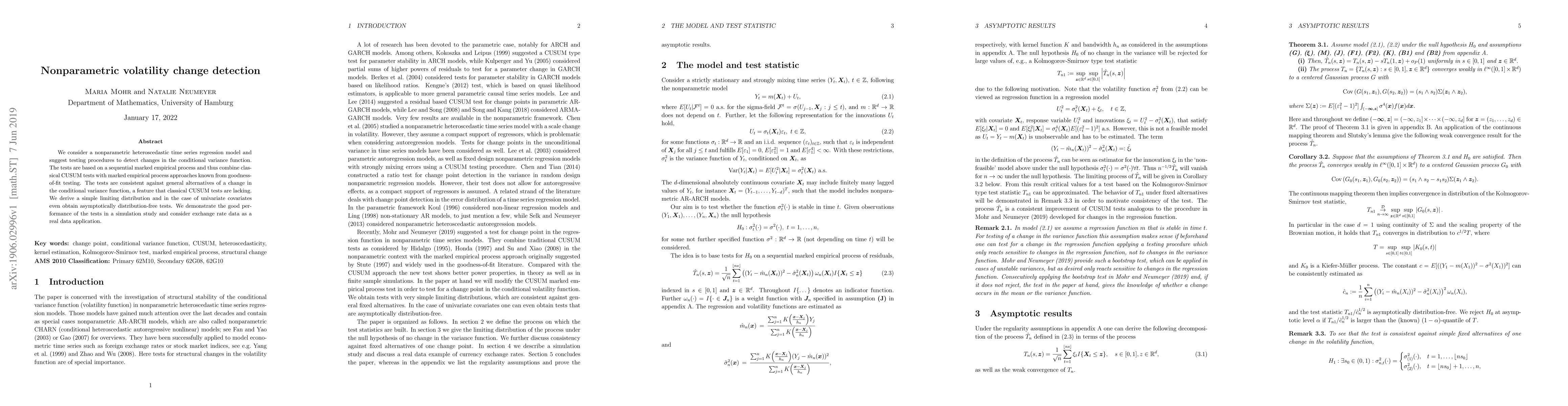 This paper proposes new tests for detecting changes in the conditional variance function in nonparametric heteroscedastic time series models. The tests combine CUSUM methods with marked empirical processes, offering consistency against general variance change alternatives, and are shown to perform well in simulations and on real exchange rate data.