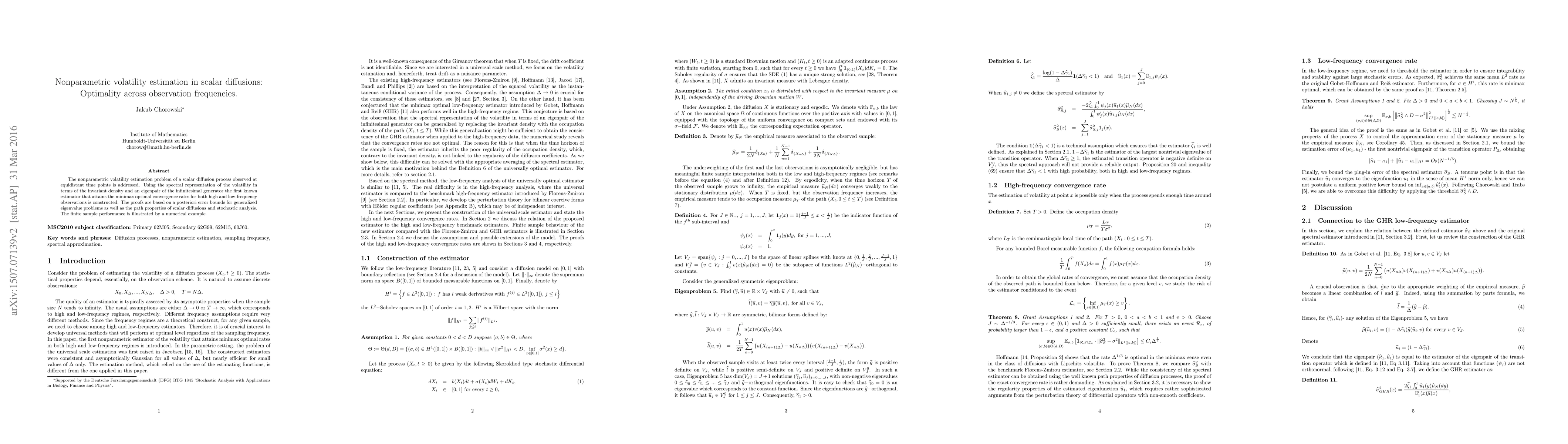 This paper constructs a nonparametric volatility estimator for scalar diffusion processes observed at equidistant intervals, achieving optimal convergence rates for both high and low-frequency observations. The methodology leverages spectral representation and stochastic analysis, with numerical examples demonstrating its finite sample performance.