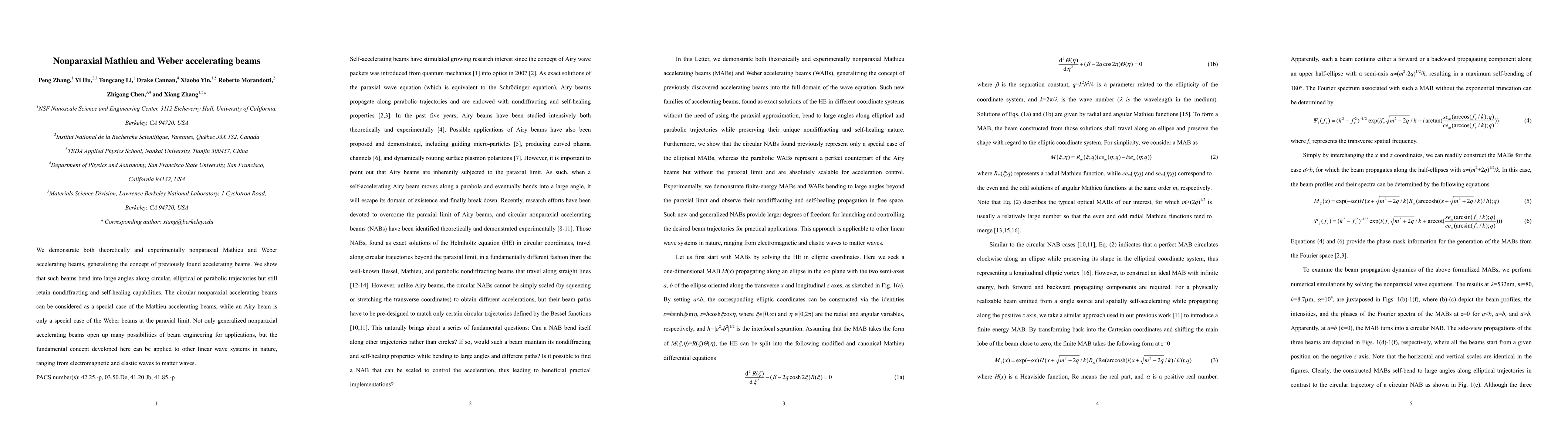 This research presents both theoretical and experimental validation of nonparaxial Mathieu and Weber accelerating beams, which generalize previously known accelerating beams, retaining nondiffraction and self-healing properties while bending along various trajectories. The findings extend beam engineering applications and apply to various linear wave systems in nature.
