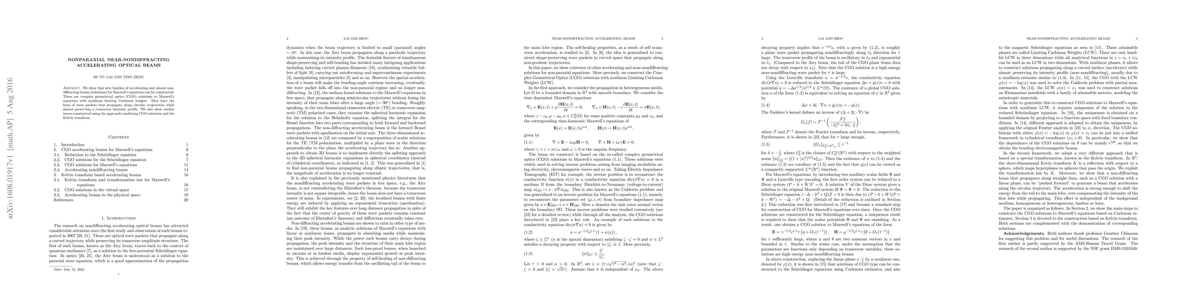We show that new families of accelerating and almost nondiffracting beams (solutions) for Maxwell's equations can be constructed. These are complex geometrical optics (CGO) solutions to Maxwell's equations with nonlinear limiting Carleman weights. They have the form of wave packets that propagate along circular trajectories while almost preserving a transverse intensity profile. We also show similar waves constructed using the approach combining CGO solutions and the Kelvin transform.