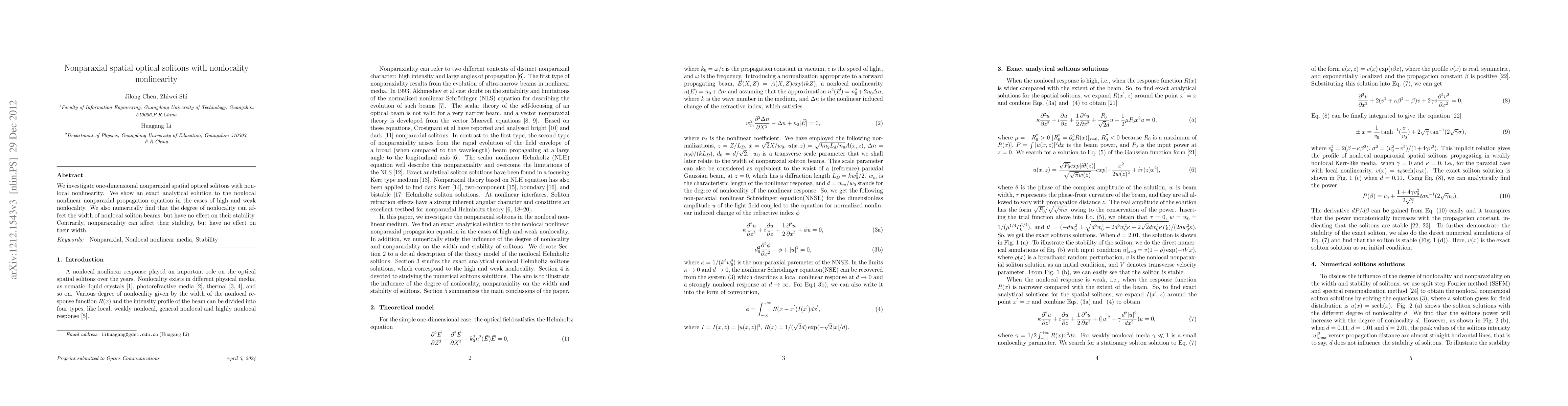 The paper presents exact analytical solutions for nonlocal nonlinear nonparaxial propagation equations and demonstrates their stability through numerical simulations.