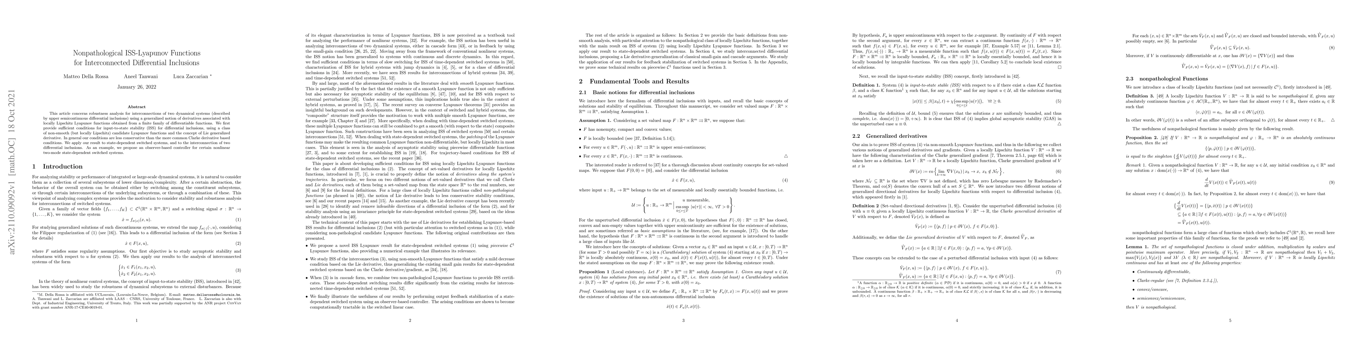 This paper develops nonpathological ISS-Lyapunov functions for interconnected differential inclusions, providing less conservative stability conditions using locally Lipschitz functions and Lie derivatives. It applies these conditions to state-dependent switched systems and proposes an observer-based controller for certain nonlinear systems.