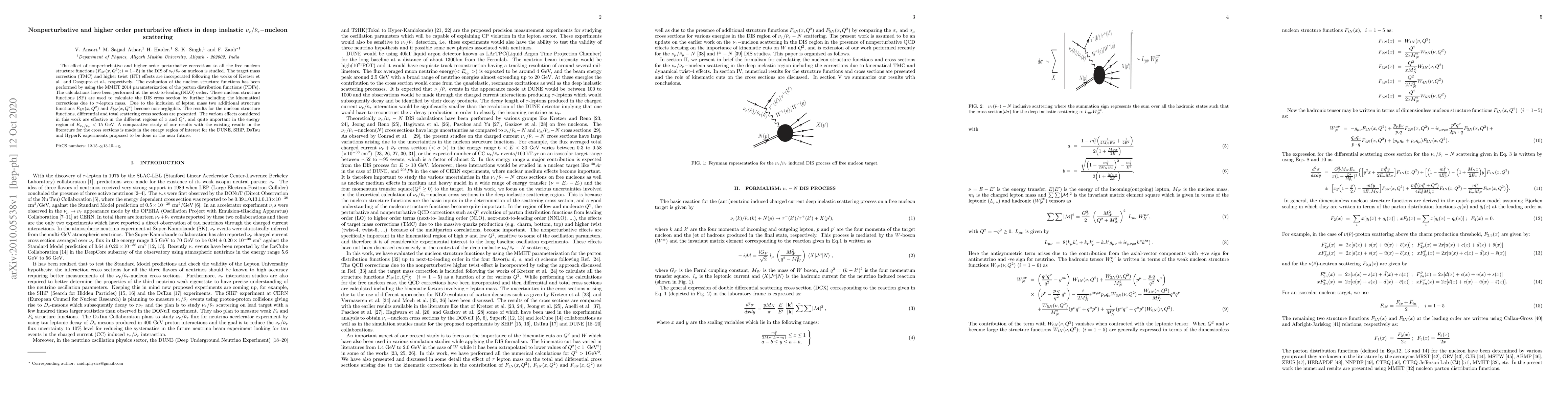 The effect of nonperturbative and higher order perturbative corrections to all the free nucleon structure functions ($F_{iN}(x,Q^2); i=1-5$) in the DIS of $\nu_\tau/{\bar\nu}_\tau$ on nucleon is studied. The target mass correction (TMC) and higher twist (HT) effects are incorporated following the works of Kretzer et al. and Dasgupta et al., respectively. The evaluation of the nucleon structure functions has been performed by using the MMHT 2014 parameterization of the parton distribution functions (PDFs). The calculations have been performed at the next-to-leading(NLO) order. These nucleon structure functions (SF) are used to calculate the DIS cross section by further including the kinematical corrections due to $\tau$-lepton mass. Due to the inclusion of lepton mass two additional structure functions $F_{4N}(x,Q^2)$ and $F_{5N}(x,Q^2)$ become non-negligible. The results for the nucleon structure functions, differential and total scattering cross sections are presented. The various effects considered in this work are effective in the different regions of $x$ and $Q^2$, and quite important in the energy region of $E_{\nu_\tau/{\bar\nu}_\tau} < 15$ GeV. A comparative study of our results with the existing results in the literature for the cross sections is made in the energy region of interest for the DUNE, SHiP, DsTau and HyperK experiments proposed to be done in the near future.