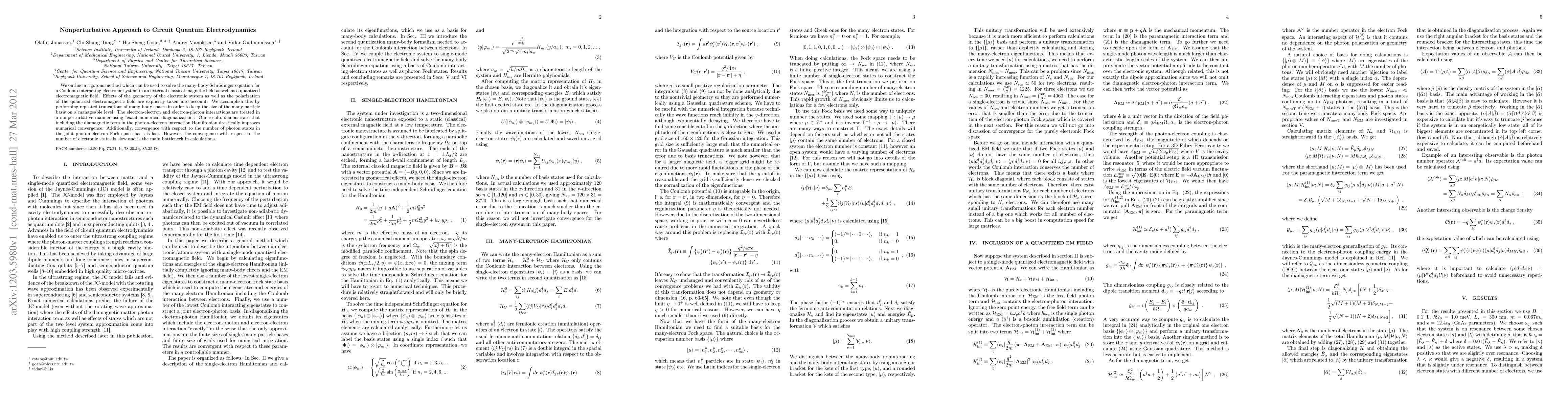 We outline a rigorous method which can be used to solve the many-body Schroedinger equation for a Coulomb interacting electronic system in an external classical magnetic field as well as a quantized electromagnetic field. Effects of the geometry of the electronic system as well as the polarization of the quantized electromagnetic field are explicitly taken into account. We accomplish this by performing repeated truncations of many-body spaces in order to keep the size of the many particle basis on a manageable level. The electron-electron and electron-photon interactions are treated in a nonperturbative manner using "exact numerical diagonalization". Our results demonstrate that including the diamagnetic term in the photon-electron interaction Hamiltonian drastically improves numerical convergence. Additionally, convergence with respect to the number of photon states in the joint photon-electron Fock space basis is fast. However, the convergence with respect to the number of electronic states is slow and is the main bottleneck in calculations.