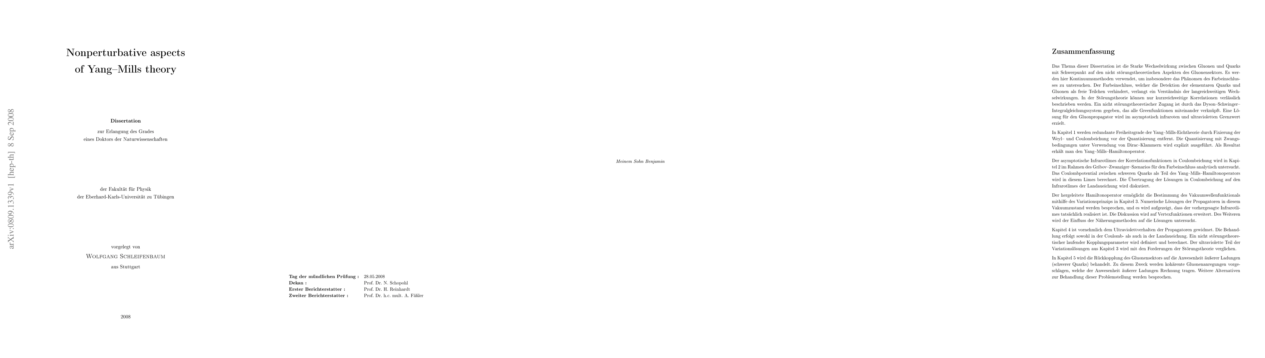 In this thesis, several aspects of Yang-Mills theory are studied. It begins with the constrained quantization in the Coulomb gauge, using the Dirac bracket formalism. A nonperturbative analysis of the infrared asymptotics of propagators in any spatial dimension follows, and a connection to the Landau gauge is given. In the Coulomb gauge Hamiltonian approach, a linearly rising static color Coulomb potential is found, along with an infrared diverging gluon energy, both signaling confinement. The propagators and vertices in the entire momentum regime are calculated with the variational principle. In the ultraviolet, a nonperturbative running coupling constant is studied, and certain asymptotic forms of the propagators are postulated. Furthermore, the back reaction of the gauge sector to the inclusion of external charges is investigated.