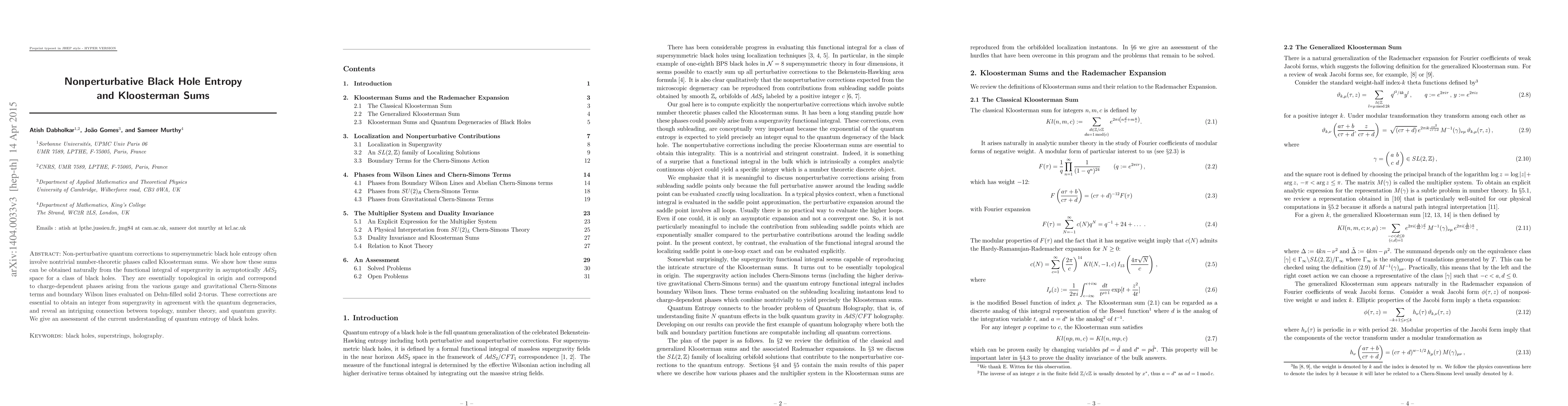 Non-perturbative quantum corrections to supersymmetric black hole entropy often involve nontrivial number-theoretic phases called Kloosterman sums. We show how these sums can be obtained naturally from the functional integral of supergravity in asymptotically AdS_2 space for a class of black holes. They are essentially topological in origin and correspond to charge-dependent phases arising from the various gauge and gravitational Chern-Simons terms and boundary Wilson lines evaluated on Dehn-filled solid 2-torus. These corrections are essential to obtain an integer from supergravity in agreement with the quantum degeneracies, and reveal an intriguing connection between topology, number theory, and quantum gravity. We give an assessment of the current understanding of quantum entropy of black holes.