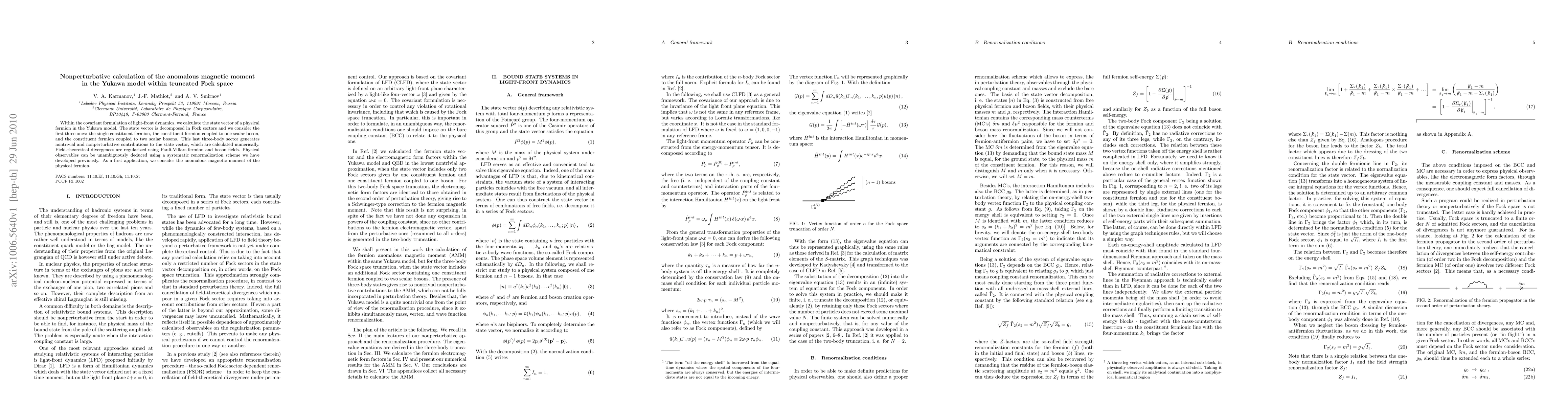 Within the covariant formulation of light-front dynamics, we calculate the state vector of a physical fermion in the Yukawa model. The state vector is decomposed in Fock sectors and we consider the first three ones: the single constituent fermion, the constituent fermion coupled to one scalar boson, and the constituent fermion coupled to two scalar bosons. This last three-body sector generates nontrivial and nonperturbative contributions to the state vector, which are calculated numerically. Field-theoretical divergences are regularized using Pauli-Villars fermion and boson fields. Physical observables can be unambiguously deduced using a systematic renormalization scheme we have developed previously. As a first application, we consider the anomalous magnetic moment of the physical fermion.