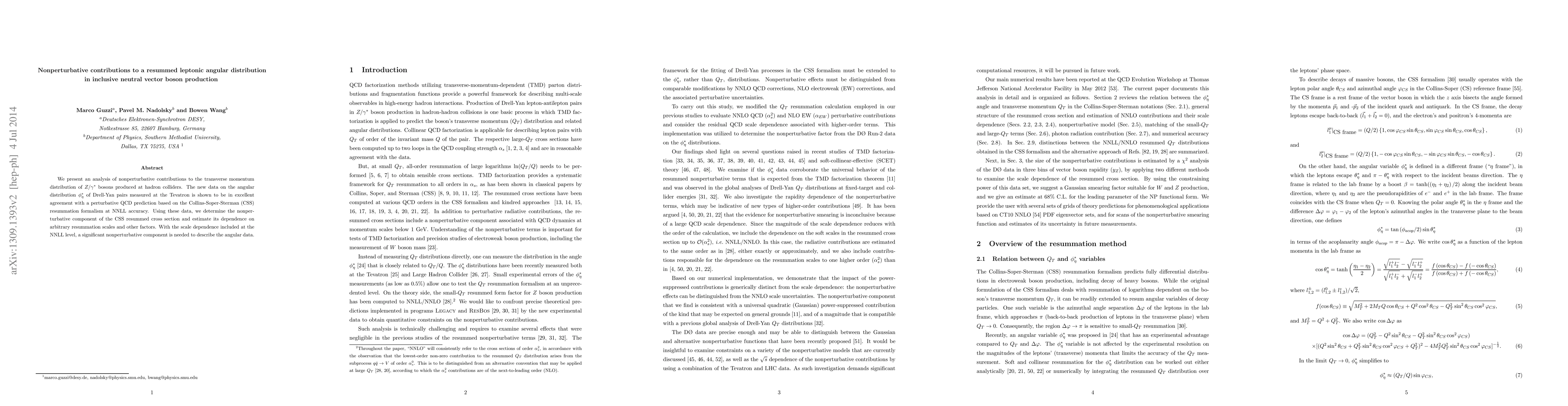 We present an analysis of nonperturbative contributions to the transverse momentum distribution of $Z/\gamma^*$ bosons produced at hadron colliders. The new data on the angular distribution $\phi^*_\eta$ of Drell-Yan pairs measured at the Tevatron is shown to be in excellent agreement with a perturbative QCD prediction based on the Collins-Soper-Sterman (CSS) resummation formalism at NNLL accuracy. Using these data, we determine the nonperturbative component of the CSS resummed cross section and estimate its dependence on arbitrary resummation scales and other factors. With the scale dependence included at the NNLL level, a significant nonperturbative component is needed to describe the angular data.