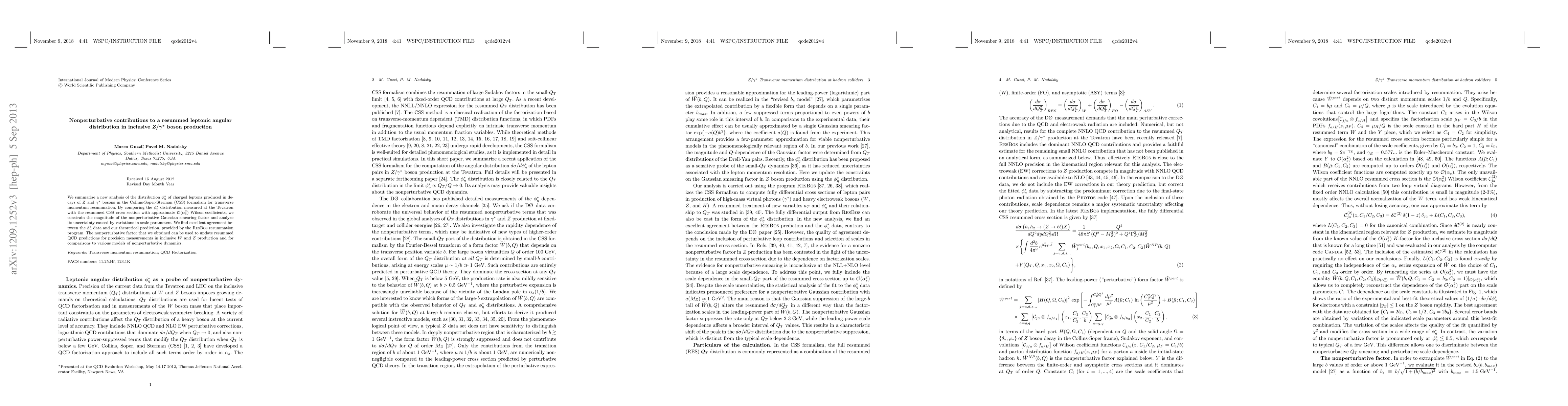 This research paper presents a new analysis of lepton angular distribution in Z and gamma* boson decays using the Collins-Soper-Sterman (CSS) formalism. By comparing experimental data from the Tevatron with theoretical predictions, the authors constrain the nonperturbative Gaussian smearing factor's magnitude and its scale parameter uncertainties. Their findings show excellent agreement between the measured and resummed CSS cross-section, which can be utilized to refine QCD predictions and compare with nonperturbative dynamics models.