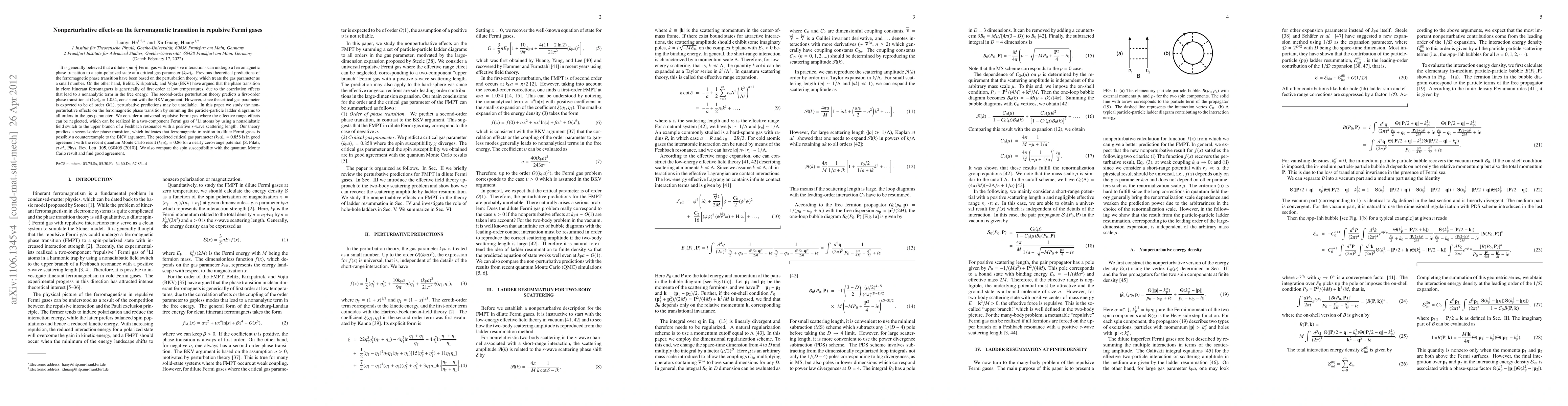 Researchers studied the ferromagnetic transition in repulsive Fermi gases using nonperturbative methods, finding a second-order phase transition with a predicted critical gas parameter of 0.858, which agrees with recent quantum Monte Carlo results.
