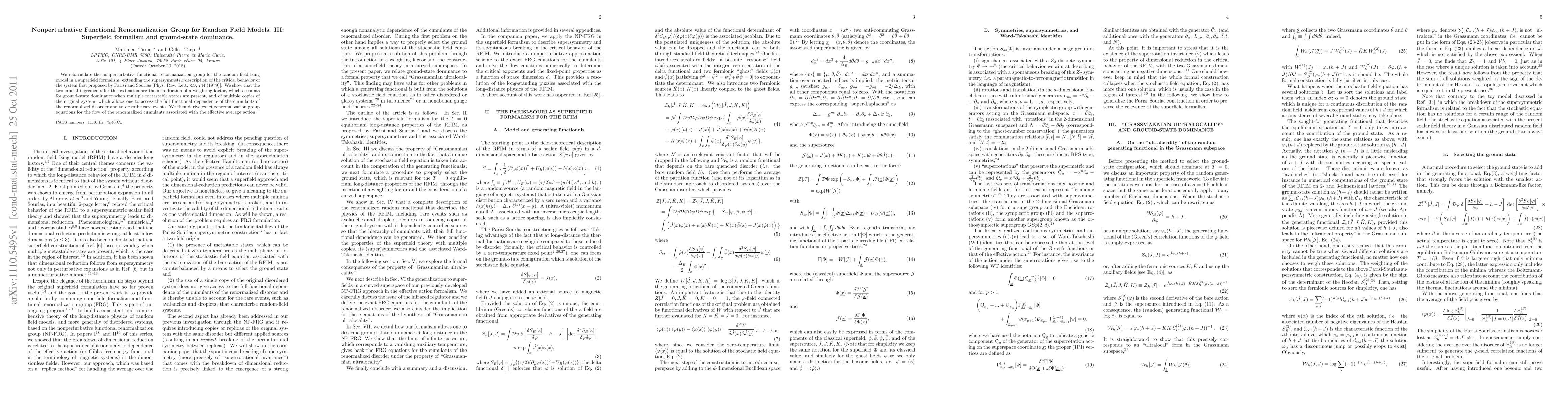 This paper reformulates the nonperturbative functional renormalization group for the random field Ising model using a superfield formalism, incorporating a weighting factor for ground-state dominance and multiple copies of the system to describe rare events. Exact renormalization group equations for the renormalized cumulants are derived.