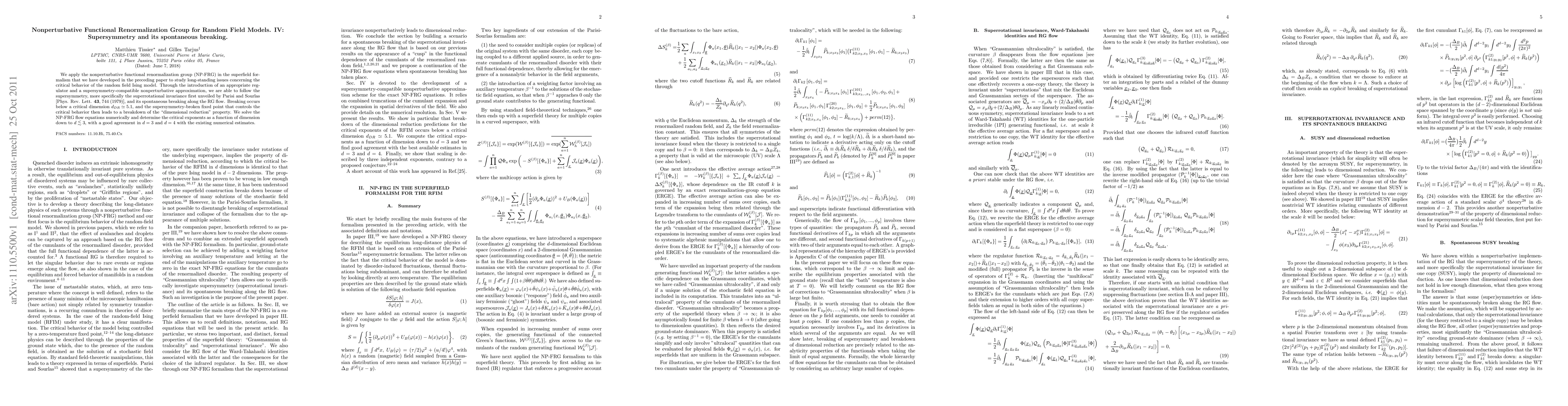 This paper applies the nonperturbative functional renormalization group (NP-FRG) to study the critical behavior of the random field Ising model, focusing on supersymmetry and its spontaneous breaking. The authors show that supersymmetry breaks below a critical dimension, leading to a breakdown of the dimensional reduction property, and determine critical exponents with good agreement to existing estimates.