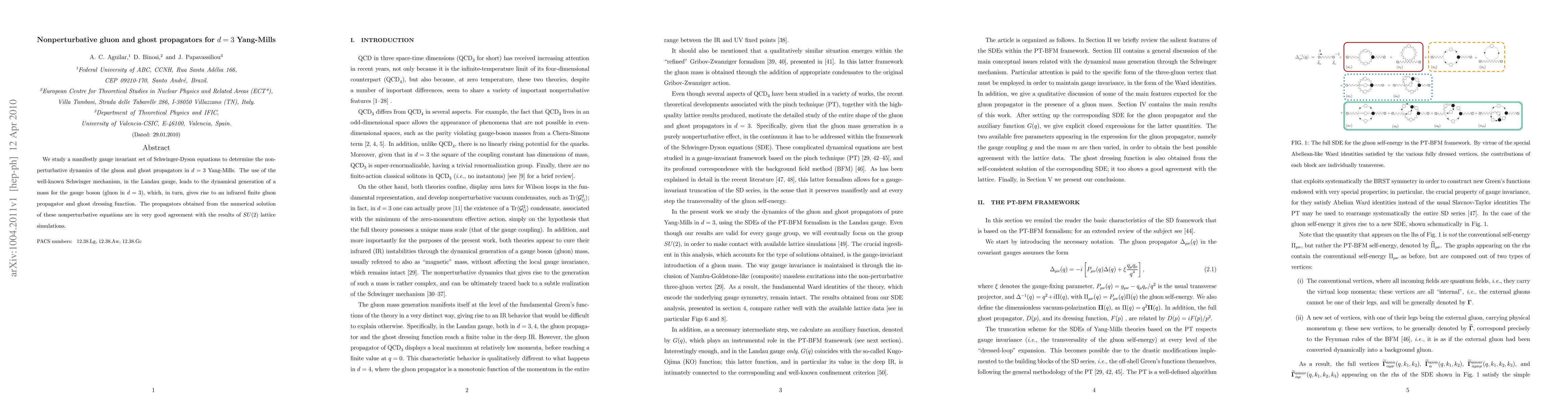 This paper investigates nonperturbative dynamics in $d=3$ Yang-Mills theory using gauge invariant Schwinger-Dyson equations, revealing the dynamical mass generation for gluons and yielding infrared finite propagators that align closely with $SU(2)$ lattice simulation results.