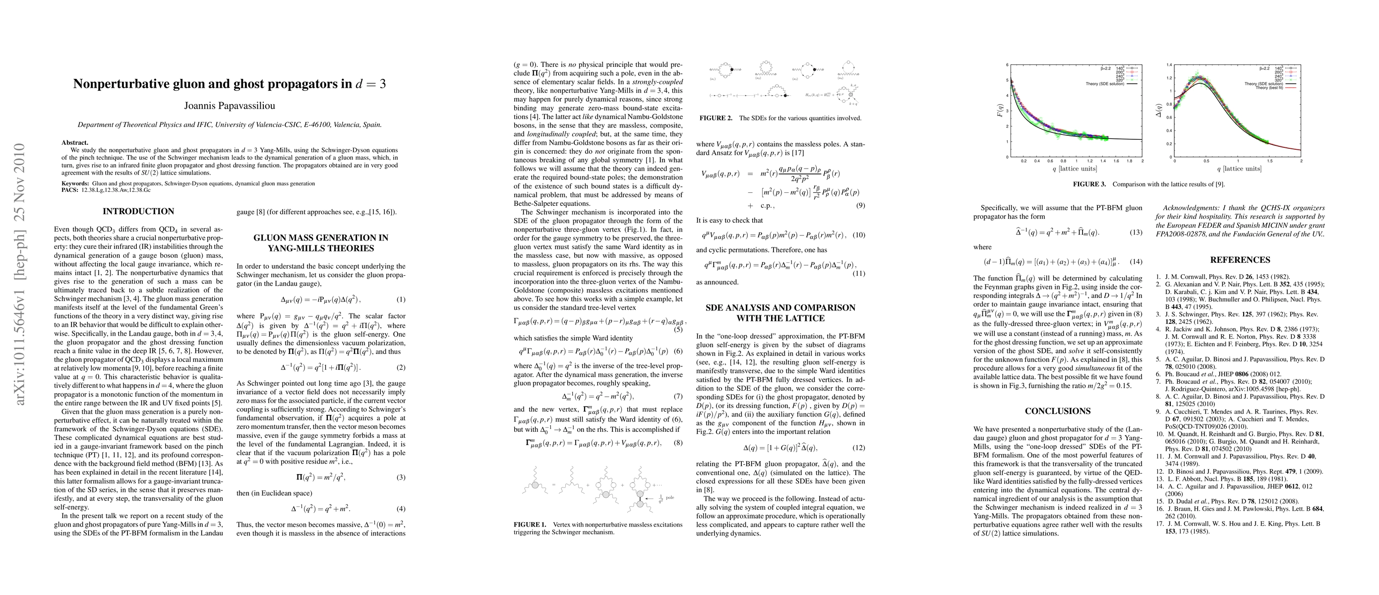 This research investigates nonperturbative gluon and ghost propagators in three-dimensional Yang-Mills theory using the Schwinger-Dyson equations and the pinch technique, revealing a dynamically generated gluon mass that results in infrared finite propagators, consistent with SU(2) lattice simulation results.