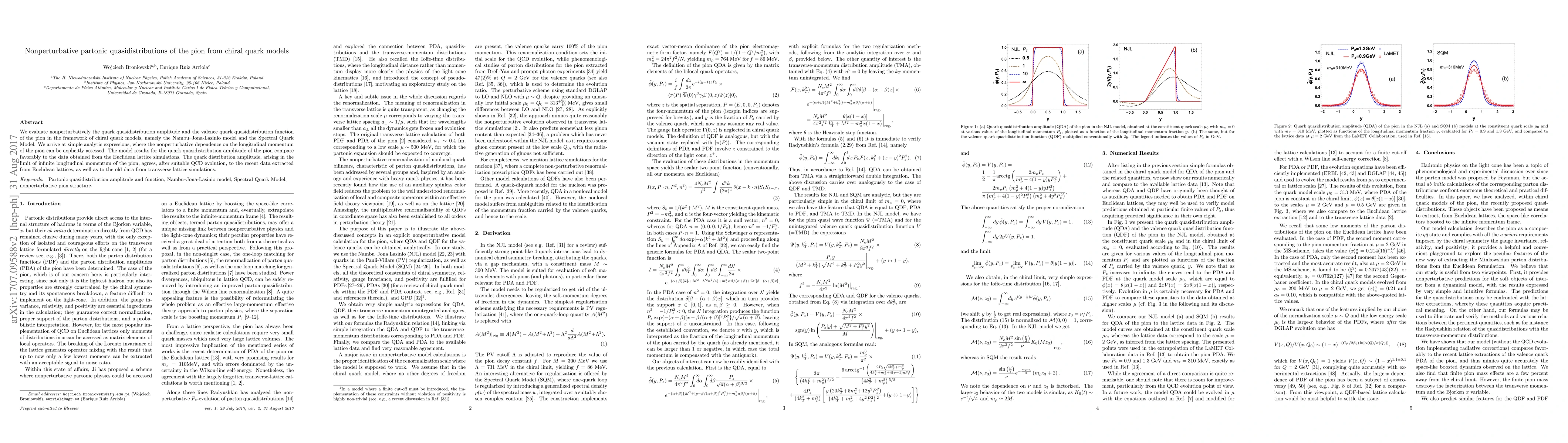 This paper evaluates nonperturbative quark quasidistributions of the pion using chiral quark models, achieving simple analytic expressions that align well with lattice simulation data. The results for the pion's quark quasidistribution amplitude and distribution amplitude show agreement with both Euclidean and transverse lattice simulation data.