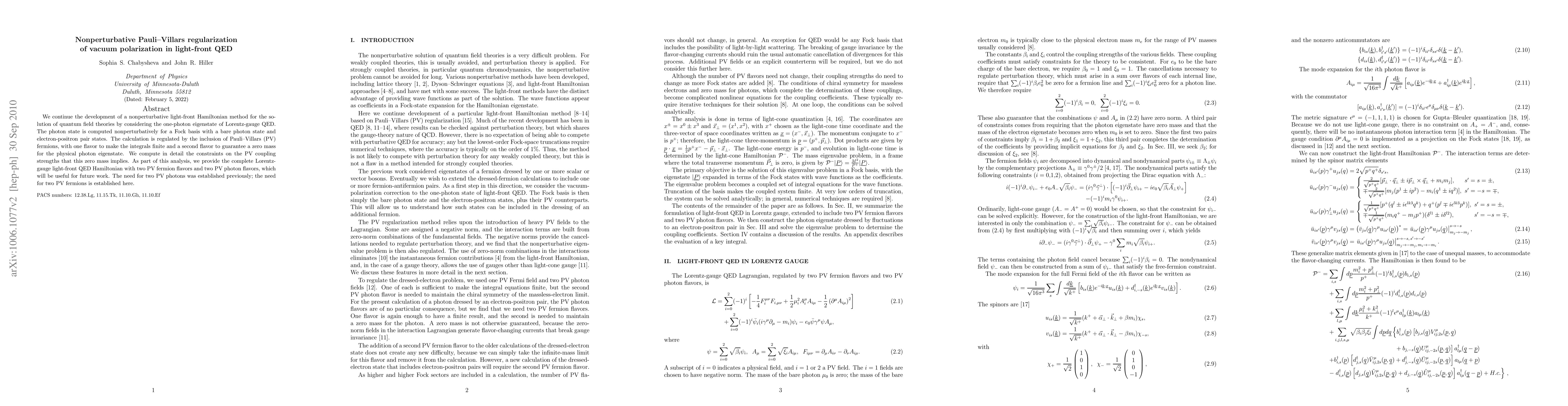 This paper develops a nonperturbative light-front Hamiltonian method for quantum field theories, focusing on vacuum polarization in light-front QED. It employs Pauli-Villars regularization with two fermion flavors and two photon flavors to ensure finite integrals and a zero mass for the physical photon eigenstate, providing a detailed Hamiltonian for future studies.
