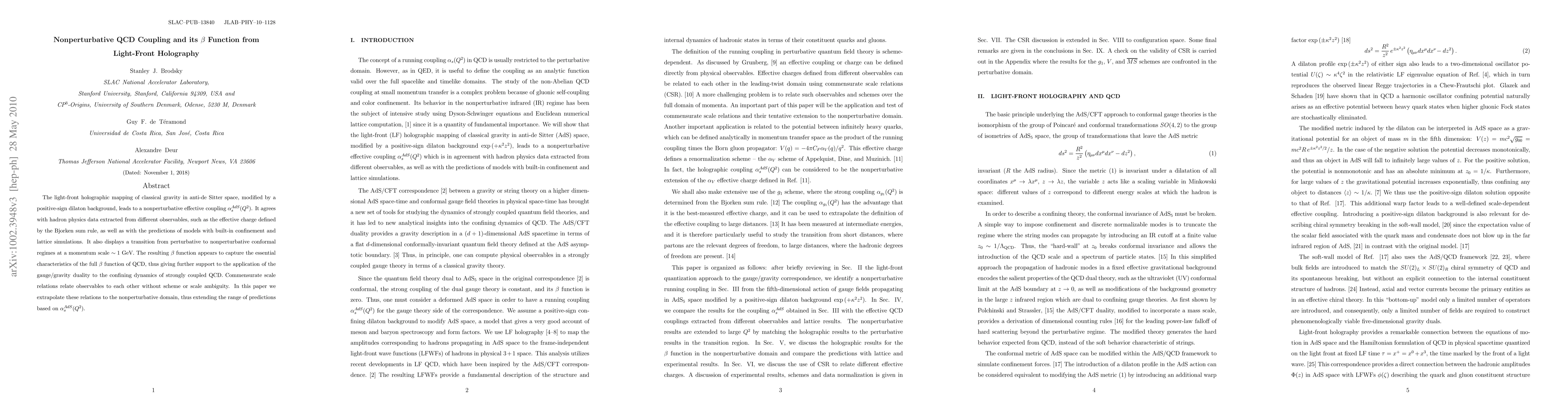 This paper uses light-front holography to derive a nonperturbative QCD coupling $\alpha_s^{AdS}(Q^2)$ that aligns with hadron physics data and lattice simulations, showing a transition from perturbative to nonperturbative conformal regimes around 1 GeV. The derived $\beta$ function captures essential QCD characteristics, supporting the gauge/gravity duality in strongly coupled QCD.