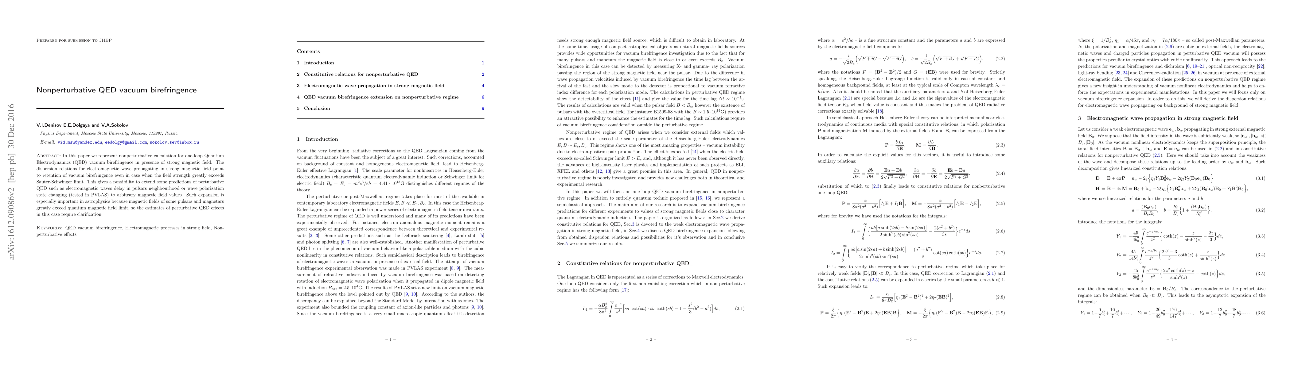 In this paper we represent nonperturbative calculation for one-loop Quantum Electrodynamics (QED) vacuum birefringence in presence of strong magnetic field. The dispersion relations for electromagnetic wave propagating in strong magnetic field point to retention of vacuum birefringence even in case when the field strength greatly exceeds Sauter-Schwinger limit. This gives a possibility to extend some predictions of perturbative QED such as electromagnetic waves delay in pulsars neighbourhood or wave polarization state changing (tested in PVLAS) to arbitrary magnetic field values. Such expansion is especially important in astrophysics because magnetic fields of some pulsars and magnetars greatly exceed quantum magnetic field limit, so the estimates of perturbative QED effects in this case require clarification.