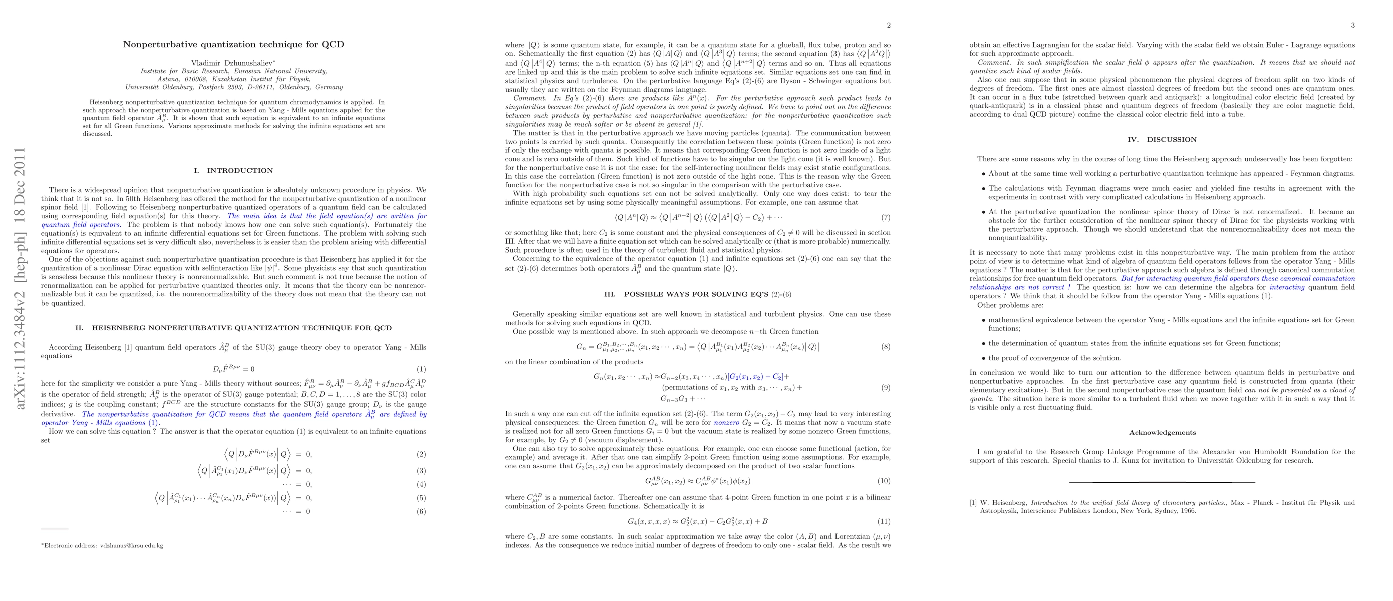 This paper applies Heisenberg's nonperturbative quantization technique to quantum chromodynamics (QCD) using Yang-Mills equations for the quantum field operator $\hat A^B_\mu$. It explores the equivalence of these equations to an infinite set of Green functions and discusses various approximate methods for solving them.