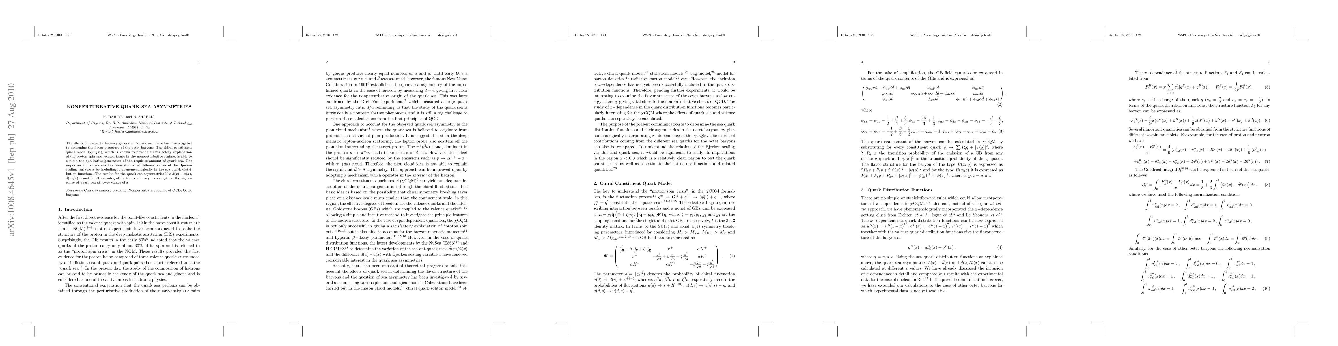 This paper explores the nonperturbative quark sea's impact on the flavor structure of octet baryons using the chiral constituent quark model. It finds that quark sea asymmetries, such as $\bar d(x)-\bar u(x)$ and $\bar d(x)/\bar u(x)$, are significant at lower Bjorken $x$ values, underscoring the quark sea's importance.