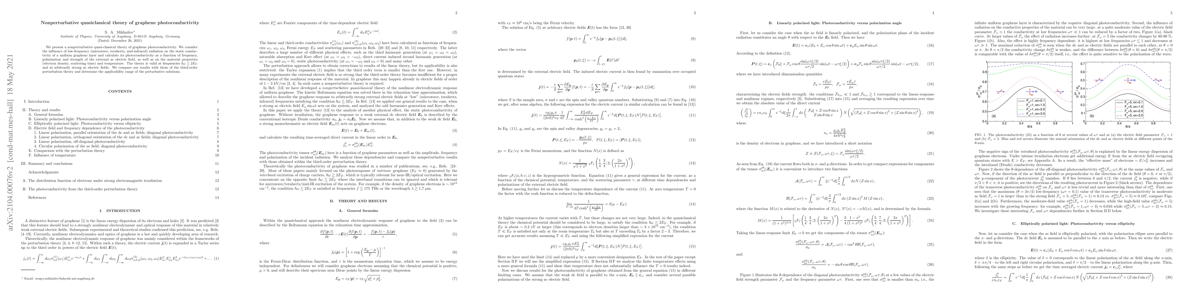 This paper develops a nonperturbative quasi-classical theory for graphene's photoconductivity under low-frequency radiation, providing detailed calculations for its frequency, polarization, and field strength dependence. The theory is compared with third-order perturbation theory to establish the limits of perturbative approaches.